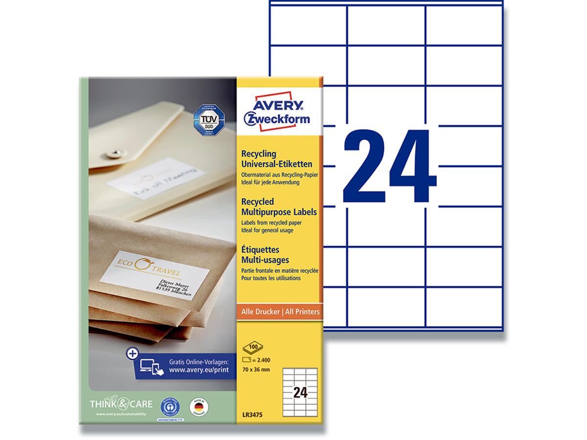 Ønsker du et ”grønnere” kontor? Bruger du allerede miljøvenlige produkter? Hvis din arbejdsplads ønsker at gøre hvad den kan for at skåne miljøet så brug Avery LR3475 Universaletiketter af 100% genbrugspapir med 24 etiketter/ark og 2.400 etiketter/pk. De er produceret af 100% genbrugspapir, har en vandbaseret og miljøvenlig lim, og er pakket i genbrugskarton. Og det er ikke det hele! Produktionsprocessen af disse etiketter er designet til at undgå unødvendig skovrydning, samt bruge mindre energi og vand. Og udover en grøn samvittighed, så får du også flotte og knivskarpe prints uanset hvilken slags printer du benytter. Avery's JamFREE™ garanti sikrer at du ikke behøver bekymre dig om etiketterne sidder fast i printeren og giver printerstop. Etiketterne klæber pålideligt og permanent. Du kan nemt og helt gratis designe og printe dine Avery produkter med vores software Avery Design & Print, hvor du finder skabeloner, grafik og designs - Klik her