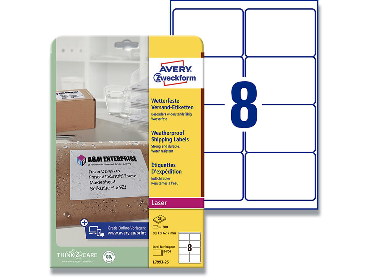 Sender du pakker og forsendelser, og vil du gerne sørge for at de kommer frem i god behold? Avery's vejrbestandige pakkeetiketter L7993-25 med 8 etiketter/ark og 200 etiketter/pk er lavet af et kraftigt polyestermateriale, som er slidstærkt og modstandsdygtigt overfor olie, smuds, vand og UV-stråler samt tåler temperaturer fra -20°C til +80°C. Det sikrer at der ikke sker udtværing af adressen hvis etiketten bliver våd, så den er altid ser proffesionel ud og er let at læse for post- og pakkebuddet. De er ideelle at bruge på alle slags kuverter og emballage også polythylen og Tyvek®-konvolutter. Du kan nemt og helt gratis designe og printe dine Avery produkter med vores software Avery Design & Print, hvor du finder skabeloner, grafik og designs - Klik her