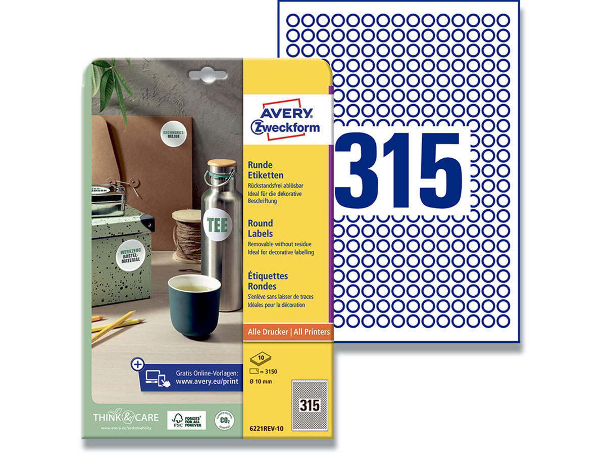 Etiketter, Ø10 mm, Hvid, 3150 etiketter i alt, Avery
