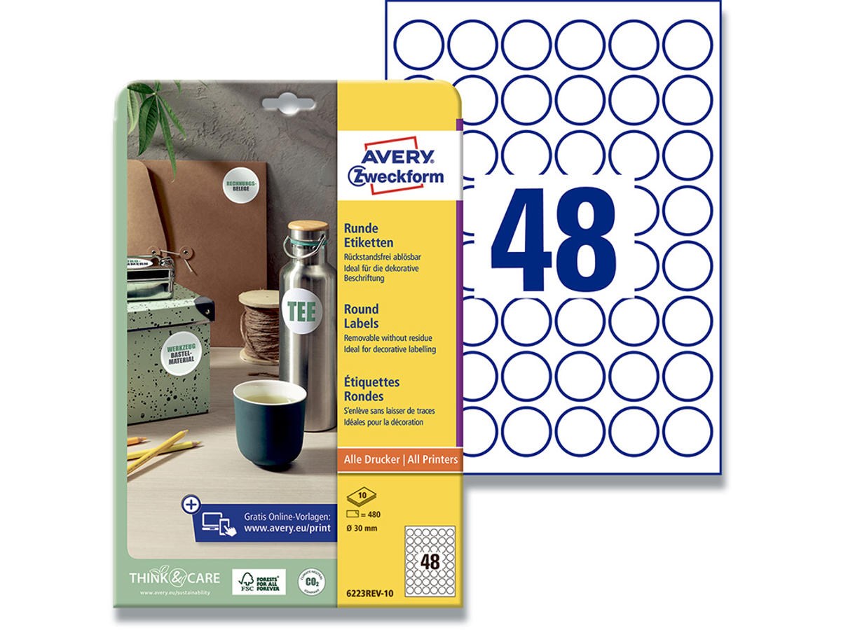 Etiketter, Ø30 mm, Hvid, 480 etiketter i alt, Avery