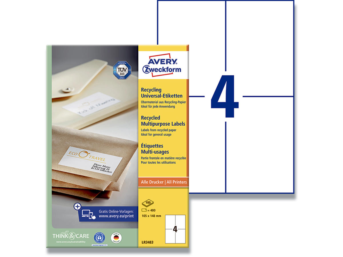 Ønsker du et ”grønnere” kontor? Bruger du allerede miljøvenlige produkter? Hvis din arbejdsplads ønsker at gøre hvad den kan for at skåne miljøet så brug Avery LR3483 Universaletiketter af 100% genbrugspapir med 4 etiketter/ark og 400 etiketter/pk. De er produceret af 100% genbrugspapir, har en vandbaseret og miljøvenlig lim, og er pakket i genbrugskarton. Og det er ikke det hele! Produktionsprocessen af disse etiketter er designet til at undgå unødvendig skovrydning, samt bruge mindre energi og vand. Og udover en grøn samvittighed, så får du også flotte og knivskarpe prints uanset hvilken slags printer du benytter. Avery's JamFREE™ garanti sikrer at du ikke behøver bekymre dig om etiketterne sidder fast i printeren og giver printerstop. Etiketterne klæber pålideligt og permanent. Du kan nemt og helt gratis designe og printe dine Avery produkter med vores software Avery Design & Print, hvor du finder skabeloner, grafik og designs - Klik her