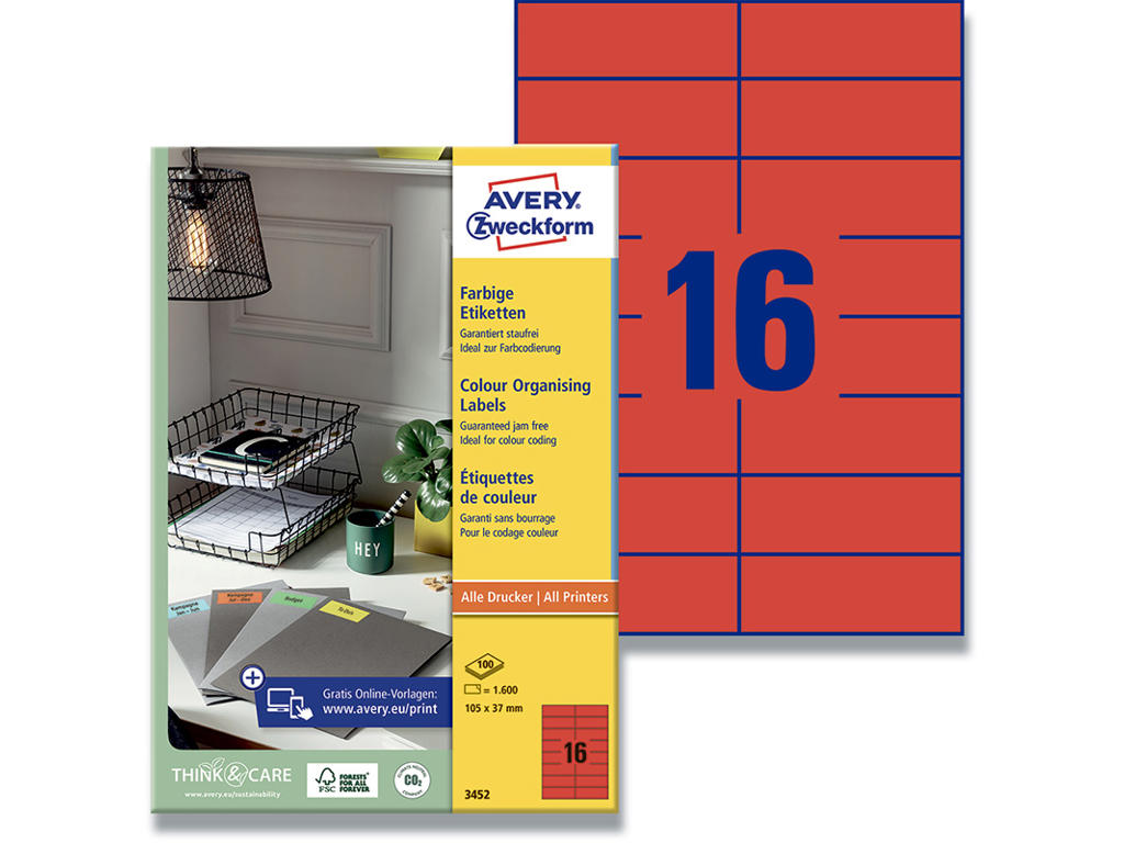 Farvede etiketter får mere opmærksomhed. Alle virksomheder sætter pris på orden. En måde at skabe orden på, er at sortere dine dokumenter efter farve, brug f.eks. Avery's 3448 permanentklæbende røde etiketter med 16 etiketter/ark og 1.600 etiketter/pakke til dine kunders dokumenter, gul for dine leverandører, blå til interne dokumenter osv.