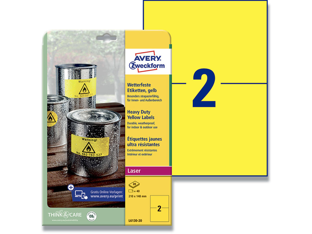 Instruktioner, vigtige meddelelser og advarsler skal være iøjnefaldende og fremstå klare og tydelige for læserne! Men hvordan kan du sikre dig, at dine instruktioner, vigtige beskeder og advarsler fanger alles opmærksomhed, er letlæselige og bliver siddende, hvor du hænger dem op? Avery’s stærke gule etiketter er særdeles velegnede til vedvarende permanent, synlig og iøjnefaldende advarselsskiltning og mærkning både inden- og udendørs, og et absolut godt valg. De er fremstillet i et stærkt holdbart polyestermateriale, som ikke kan rives i stykker, og de klæber permanent og pålideligt. Etiketpapiret er skarp gult, og papirkvaliteten giver dig flotte og knivskarpe prints. Etiketterne er modstandsdygtige overfor olie, snavs, vand, fugt, UV-stråler og temperaturer mellem -20°C og +80°C. Det gør dem ideelle udendørs i alt slags vejr og indendørs, i miljøer med høje krav til holdbarhed. Anvendelsesmulighederne indenfor advarselsskiltning og mærkning er utallige. De henvender sig f.eks. til elektrikere, installatører håndværkere, produktionsvirksomheder, malervirksomheder, laboratorier, hospitaler, lagerfaciliteter m.v. hvor arbejdssikkerheden skal være i top, og hvor der mange advarsler forbundet med brug af produktionsudstyr, el-tavler, målerskabe mv. Avery's L6130-20 gule stærke etiketter har 2 etiketter/ark og 40 etiketter/pk, hvor hver etiket måler 199,6 x 143,5 mm. Etiketternes størrelse er velegnet til skiltning og store genstande. Etiketterne kan printes i alle s/h laserprintere. Og Avery's JamFREE™ garanti sikrer at du ikke behøver bekymre dig om etiketterne sidder fast i printeren og giver printerstop. Du kan nemt og helt gratis designe og printe dine Avery produkter med vores software Avery Design & Print, hvor du finder skabeloner, grafik og designs - Klik her
