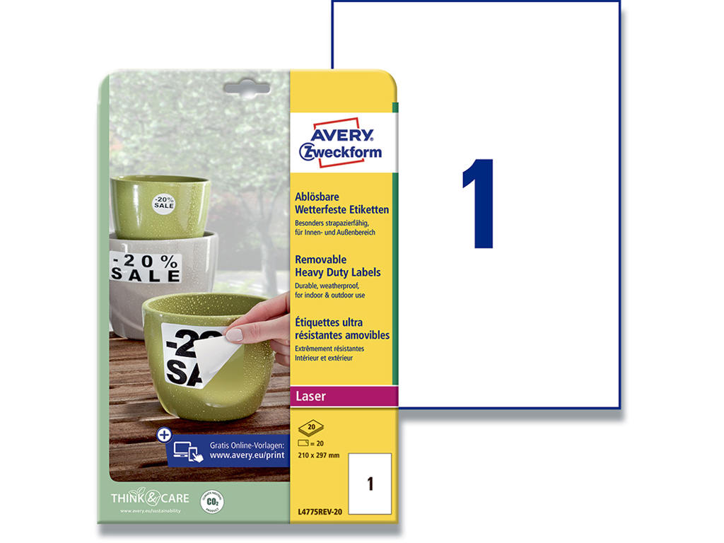 Avery’s aftagelige stærke etiketter er særdeles velegnede, når du har brug for en holdbar midlertidig mærkning af genstande. Eller hvis du skal skilte udendørs, hvor informationen kun skal være gældende i en kort periode, og du derefter skal kun fjernes skiltet eller etiketten uden stort besvær og brug af opløsningsmidler. Avery’s aftagelige stærke etiketter opfylder begge behov. Dels er de fremstillet i et stærkt holdbart polyestermateriale, som ikke kan rives i stykker. De er modstandsdygtige overfor olie, snavs, vand, fugt, UV-stråler og temperaturer mellem -20°C og +80°C. Det gør dem ideelle udendørs i alt salgs vejr og indendørs, i miljøer med høje krav til holdbarhed. Derudover er de fremstillet med aftagelig lim, hvorfor du kan fjernes dem igen, uden at der efterlades limrester og mærker, hvor de har siddet. Anvendelsesmulighederne er utallige, de er bl.a. perfekte i gartnerier og planteskoler mv. til prisskiltning, blomster-’containerne’ og andet udendørs skiltning. Lagerfaciliteter, som hyldeforkantsmærkning, kasser, bokse mv. Marketing-materiale til udendørsskiltning, som jævnligt skifter mm. Avery's L4775REV-20 aftagelige stærke etiketter har 1 etiket/ark og 20 etiketter/pk, hvor hver etiket måler 210 x 297 mm. Etiketternes størrelse er velegnet til mellemstore genstande og skilte. Etiketterne kan printes i alle laser- og farvelaserprintere. Den høje papirkvalitet giver dig flotte og knivskarpe prints. Og Avery's JamFREE™ garanti sikrer at du ikke behøver bekymre dig om etiketterne sidder fast i printeren og giver printerstop. Du kan nemt og helt gratis designe og printe dine Avery produkter med vores software Avery Design & Print, hvor du finder skabeloner, grafik og designs -