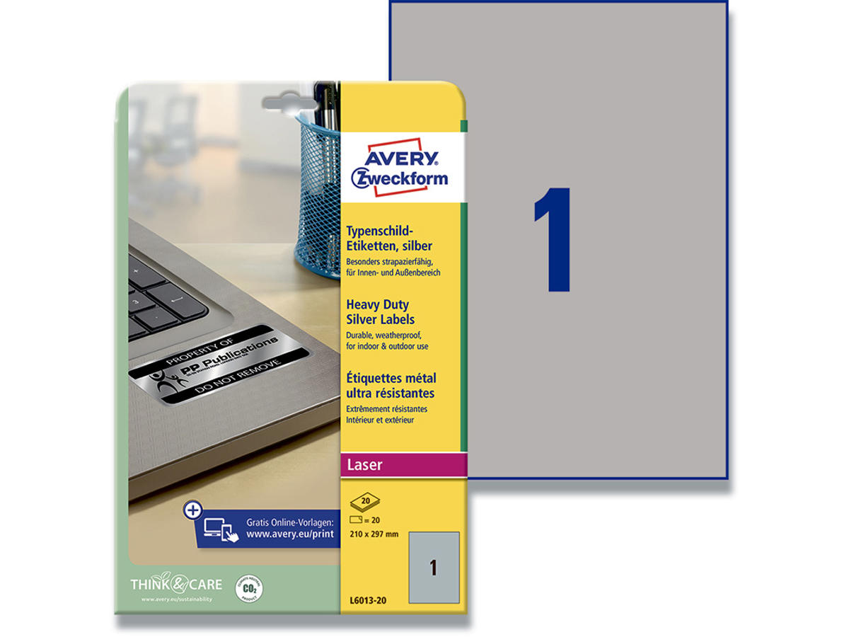 Arbejder du som IT-ansvarlig i en større virksomhed eller på en skole, hvordan kan du så vide, hvilken computer, som tilhører hvilken medarbejder eller elev? Eller hvordan kan du være sikker på, at alt er på rette sted og let kan spores, hvis uheldet skulle være ude, og IT-udstyr stjæles? Mærkning af elektronisk udstyr, mobile enheder eller andre værdifulde genstande som værktøj, inventar og maskiner kan løse problemet og spare både dig selv, dem som bruger genstandene og i værste fald politiet meget arbejde, tid og manglende overblik. Avery’s sølv etiketter er ideelle til mærkning af computere, printere, mobile enheder mv. da de er langt mere holdbare end gængse papiretiketter. De er fremstillet i et stærkt holdbart polyestermateriale, som ikke kan rives i stykker, og de klæber permanent og pålideligt. Etiketpapiret har et flot sølv finish, som passer perfekt på It-udstyret. Papirkvaliteten giver dig samtidigt flotte og knivskarpe prints. Sølvetiketterne er modstandsdygtige overfor olie, snavs, vand, fugt, UV-stråler og temperaturer mellem -40°C og +150°C. Det gør dem ideelle udendørs i alt slags vejr og indendørs, i miljøer med høje krav til holdbarhed. Etiketterne er også UL certificeret. Det selvklæbende papirmateriale er blevet testet og godkendt af Independent Underwrites Laboratories Inc. (UL). Det opfylder standarden UL969 (“Marking and Labelling Systems”). Kategorien er PGJI2 - printing Materials Component, UL certification nr. er MH16635. Averys’ stærke sølv etiketter henvender sig f.eks. til IT-afdelinger, skoler og andre uddannelsesinstitutioner, biblioteker og andre offentlige institutioner, virksomheder med åbne kontormiljøer, håndværkere, entreprenør-virksomheder, hvor der er meget IT-udstyr installeret eller værktøj i brug. Derudover at være perfekte til mærkning af IT-udstyr, er etiketterne også et rigtig godt valg, som stilfuld mærkning på brochurer og andet salgsfremmende materiale. Avery's L6013-20 stærke sølv etiketter har 1 etiket/ark og 20 etiketter/pk, hvor hver etiket måler 210 x 297 mm. Etiketternes størrelse er velegnet til store genstande. Etiketterne kan printes i alle s/h laserprintere. Avery's JamFREE™ garanti sikrer, at du ikke behøver bekymre dig om etiketterne sidder fast i printeren og giver printerstop. Du kan nemt og helt gratis designe og printe dine Avery produkter med vores software Avery Design & Print, hvor du finder skabeloner, grafik og designs - Klik her