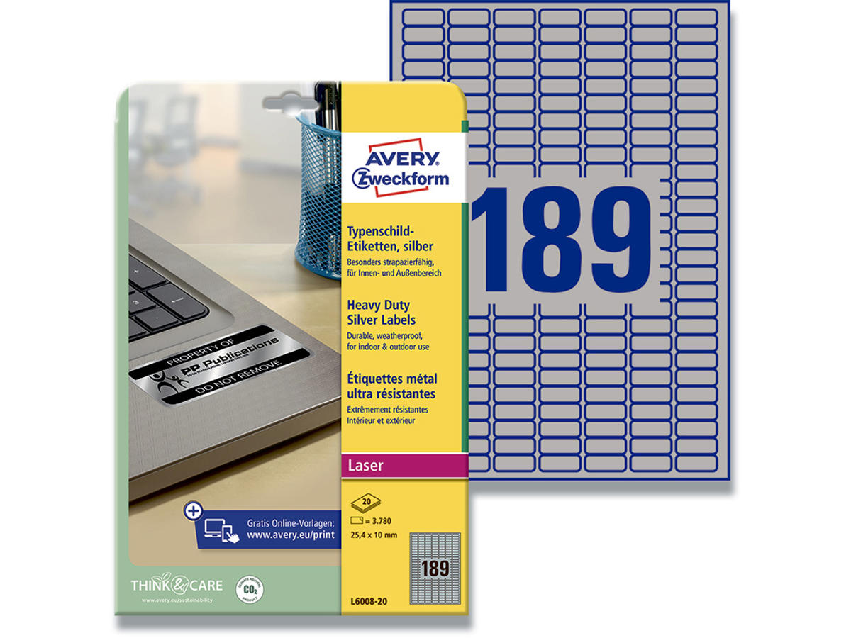 Arbejder du som IT-ansvarlig i en større virksomhed eller på en skole, hvordan kan du så vide, hvilken computer, som tilhører hvilken medarbejder eller elev? Eller hvordan kan du være sikker på, at alt er på rette sted og let kan spores, hvis uheldet skulle være ude, og IT-udstyr stjæles? Mærkning af elektronisk udstyr, mobile enheder eller andre værdifulde genstande som værktøj, inventar og maskiner kan løse problemet og spare både dig selv, dem som bruger genstandene og i værste fald politiet meget arbejde, tid og manglende overblik. Avery’s sølv etiketter er ideelle til mærkning af computere, printere, mobile enheder mv. da de er langt mere holdbare end gængse papiretiketter. De er fremstillet i et stærkt holdbart polyestermateriale, som ikke kan rives i stykker, og de klæber permanent og pålideligt. Etiketpapiret har et flot sølv finish, som passer perfekt på It-udstyret. Papirkvaliteten giver dig samtidigt flotte og knivskarpe prints. Sølvetiketterne er modstandsdygtige overfor olie, snavs, vand, fugt, UV-stråler og temperaturer mellem -40°C og +150°C. Det gør dem ideelle udendørs i alt slags vejr og indendørs, i miljøer med høje krav til holdbarhed. Etiketterne er også UL certificeret. Det selvklæbende papirmateriale er blevet testet og godkendt af Independent Underwrites Laboratories Inc. (UL). Det opfylder standarden UL969 (“Marking and Labelling Systems”). Kategorien er PGJI2 - printing Materials Component, UL certification nr. er MH16635. Averys’ stærke sølv etiketter henvender sig f.eks. til IT-afdelinger, skoler og andre uddannelsesinstitutioner, biblioteker og andre offentlige institutioner, virksomheder med åbne kontormiljøer, håndværkere, entreprenør-virksomheder, hvor der er meget IT-udstyr installeret eller værktøj i brug. Derudover at være perfekte til mærkning af IT-udstyr, er etiketterne også et rigtig godt valg, som stilfuld mærkning på brochurer og andet salgsfremmende materiale. Avery's L6008-20 stærke sølv etiketter har 189 etiketter/ark og 3780 etiketter/pk, hvor hver etiket måler 25,4 x 10 mm. Etiketternes størrelse er velegnet til små og mindre genstande. Etiketterne kan printes i alle s/h laserprintere. Avery's JamFREE™ garanti sikrer, at du ikke behøver bekymre dig om etiketterne sidder fast i printeren og giver printerstop. Du kan nemt og helt gratis designe og printe dine Avery produkter med vores software Avery Design & Print, hvor du finder skabeloner, grafik og designs -