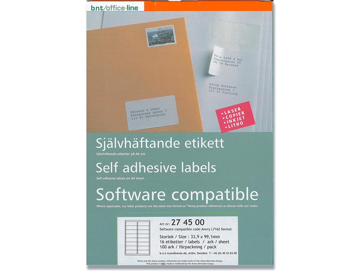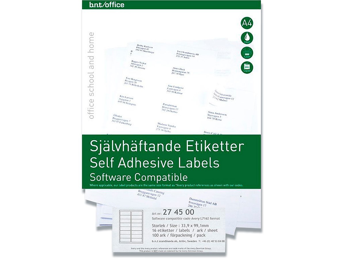 Etiketter, 33.9x99.1 mm, Hvid, 1600 etiketter i alt, BNT Office