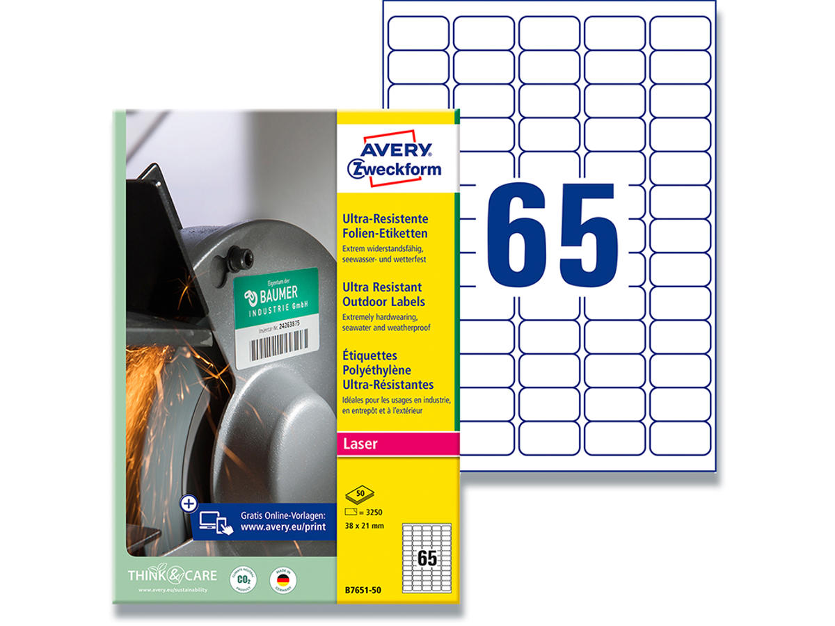 Etiketter, 38x21 mm, Hvid, 3.250 etiketter i alt, Avery Ekstremt modstandsdygtig