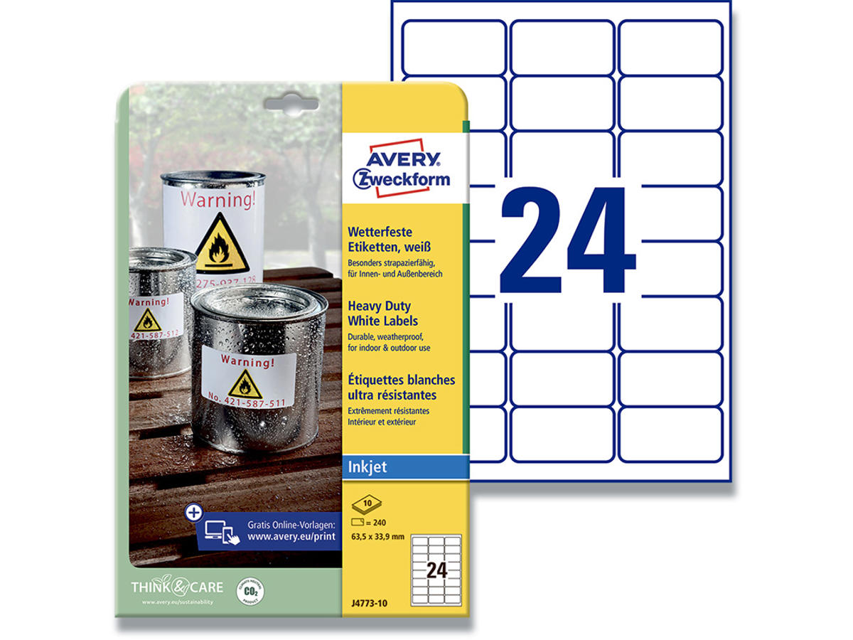 Avery’s hvide stærke etiketter er særdeles velegnede, når du har brug for en holdbar vedvarende mærkning af IT-udstyr, mobile enheder, værktøj, inventar mv. Når du mærker dine genstande, bliver det nemt at genkende genstandene og nemt at finde den rette ejermand ved f.eks. tyveri eller på større arbejdspladser, hvor flere håndværkere fra forskellige virksomheder, er i gang samtidig med hver deres værktøj. De hvide stærke etiketter er ideelle, da de er langt mere holdbare end gængse papiretiketter. De er fremstillet i et stærkt holdbart polyestermateriale, som ikke kan rives i stykker, og de klæber permanent og pålideligt. De er modstandsdygtige overfor olie, snavs, vand, fugt, UV-stråler og temperaturer mellem -20°C og +80°C. Det gør dem ideelle udendørs i alt slags vejr og indendørs, i miljøer med høje krav til holdbarhed. De henvender sig f.eks. til IT-afdelinger, skoler og andre uddannelsesinstitutioner, biblioteker og andre offentlige institutioner, virksomheder med åbne kontormiljøer, håndværkere, entreprenør-virksomheder, hvor der er meget IT-udstyr installeret eller værktøj i brug. Avery's J4773-10 hvide stærke etiketter har 24 etiketter/ark og 240 etiketter/pk, hvor hver etiket måler 63,5 x 33,9 mm. Etiketternes størrelse er velegnet til mindre genstande. Etiketterne kan printes i alle laser- og farvelaserprintere. Den høje papirkvalitet giver dig flotte og knivskarpe prints. Og Avery's JamFREE™ garanti sikrer at du ikke behøver bekymre dig om etiketterne sidder fast i printeren og giver printerstop. Du kan nemt og helt gratis designe og printe dine Avery produkter med vores software Avery Design & Print, hvor du finder skabeloner, grafik og designs -