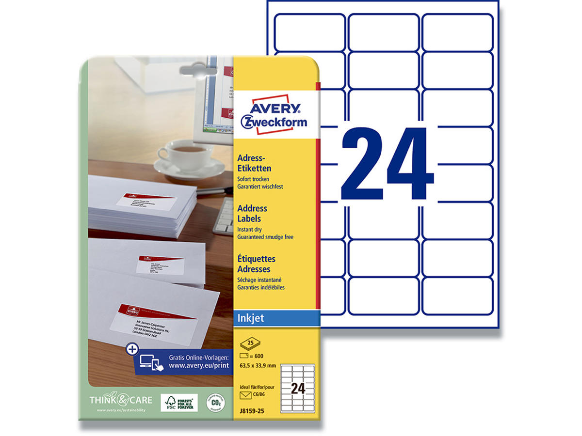 Arbejder du hovedsagligt med en inkjetprinter og har du ikke tid til at vente på at blækket tørrer, så skal du vælge Avery J8159-25 hurtigtørrende etiketter til inkjet printere med 24 etiketter/ark og 600 etiketter/pk. De er velegnede til breve, pakker og rør i alle størrelser. Deres special coatede QuickDRY™ overflade sørger for at blækket øjeblikkeligt absorberes i papiret, så du kan tage arket direkte fra printeren og arbejde med det uden afsmitning af blæk. Avery's JamFREE™ garanti sikrer at du ikke behøver bekymre dig om etiketterne sidder fast i printeren og giver printerstop. Avery's aftagelige universaletiketter hjælper dig også med at passe på miljøet, da de kan genanvendes sammen med almindeligt papiraffald. Du kan nemt og helt gratis designe og printe dine Avery produkter med vores software Avery Design & Print, hvor du finder skabeloner, grafik og designs - Klik her