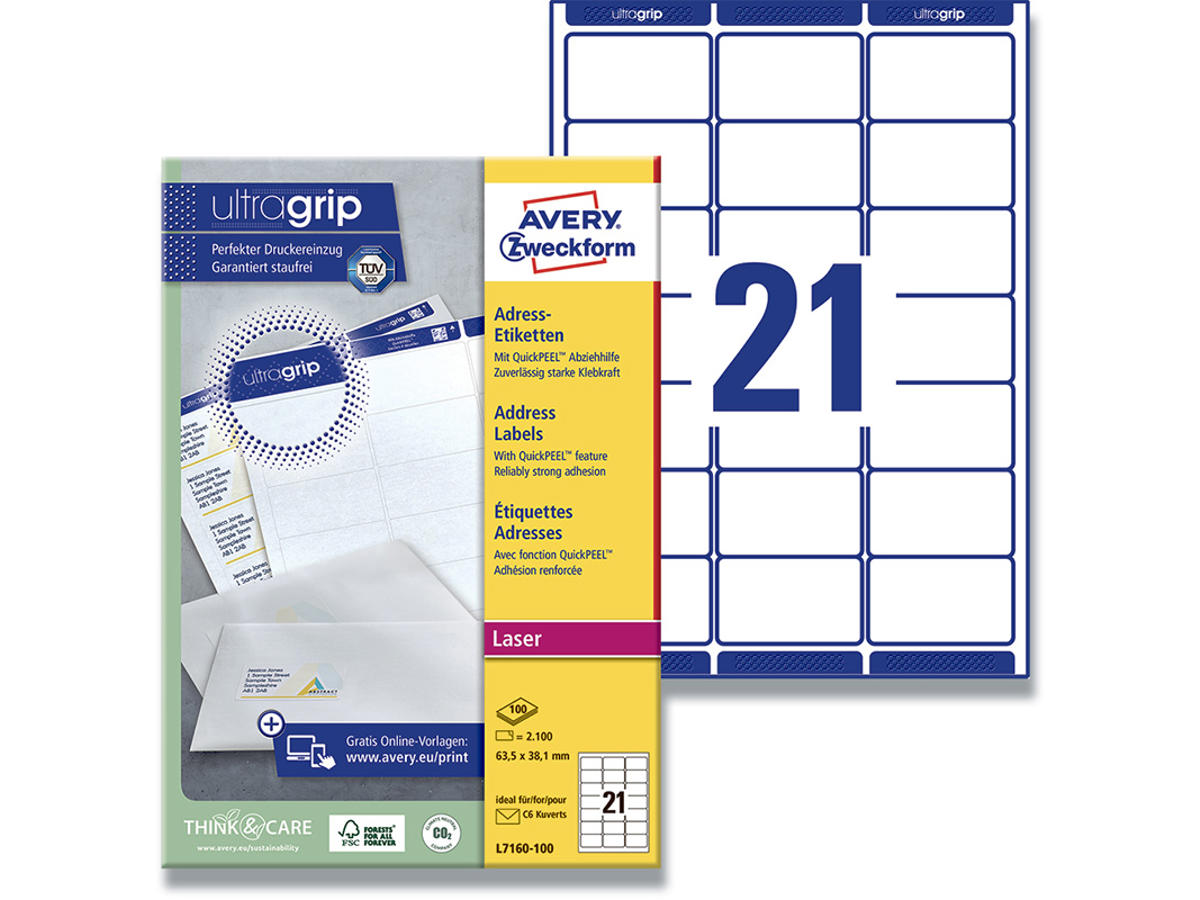 Du har kun to hænder, men et hav af opgaver på dit skrivebord. Og invitationen til næste uges konference skal med posten senest i eftermiddag kl. 16.00 - men hvordan skal du nå det hele på den halve tid? Store som små brevudsendelser bliver meget nemmere når du bruger Avery's hvide L7160-100 QuickPEEL™ etiketter med 21 etiketter/ark og 2.100 etiketter/pk. Du skal blot fjerne den perforerede del af bagarket for at blotte hjørnerne af etiketterne så du nemt kan få dem af og sætte dem på konvolutterne. Det giver en væsentlig tidsbesparelse, fordi du ikke skal fumle med at få fat i hjørnerne af etiketterne – faktisk helt op til 25% af den tid, du bruger, hvis du ikke benytter QuickPEEL™ funktionen. Du kan selvfølgelig også tage dem af på normalvis uden at fjerne den perforerede del. Denne pakke med 100 ark er perfekt til store brevforsendelser og etiketstørrelsen er især god til C6 konvolutter. De er kompatible med alle standard s/h- og farvelaserprintere. Den høje papirkvalitet giver dig flotte og knivskarpe prints. Og Avery's JamFREE™ garanti sikrer at du ikke behøver bekymre dig om etiketterne sidder fast i printeren og giver printerstop. Etiketterne klæber pålideligt og permanent. Avery's etiketter med QuickPEEL™ sparer dig ikke kun tid, men hjælper dig også med at passe på miljøet, da de kan genanvendes sammen med almindeligt papiraffald. Du kan nemt og helt gratis designe og printe dine Avery produkter med vores software Avery Design & Print, hvor du finder skabeloner, grafik og designs - Klik her