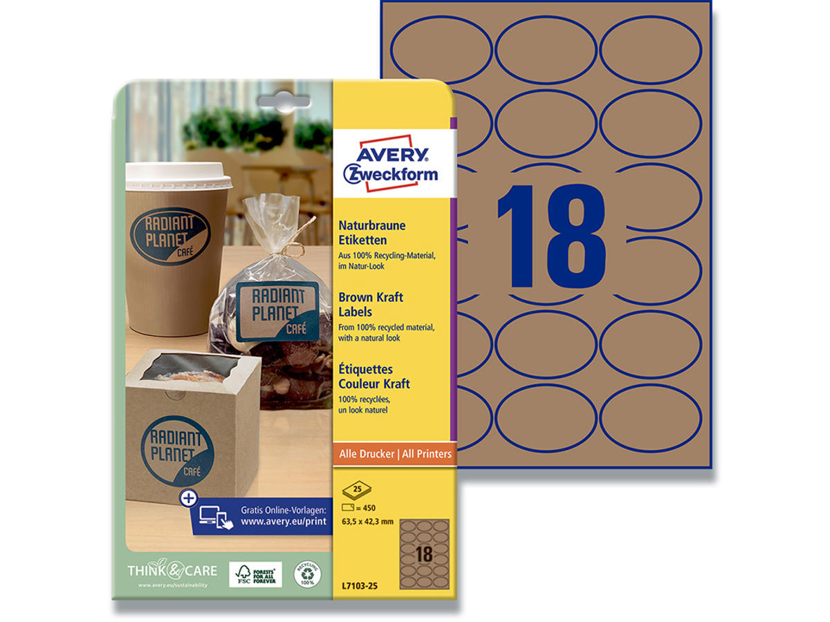 Kan man både være moderne og miljøvenlig? Ja da! Giv dine produkter et moderne naturlook med Avery's L7103-25 naturbrune ovale etiketter med 18 etiketter/ark og 360 etiketter/pakke, de er miljøvenlige og fremstillet af 100% genbrugsmateriale. Etiketterne klæber permanent og ser flotte ud på både æsker, poser, krukker og ligenden. De egner sig til at blive printet til kant. Kan printes i alle printere. Du kan nemt og helt gratis designe og printe dine Avery produkter med vores software Avery Design & Print, hvor du finder skabeloner, grafik og designs - Klik her
