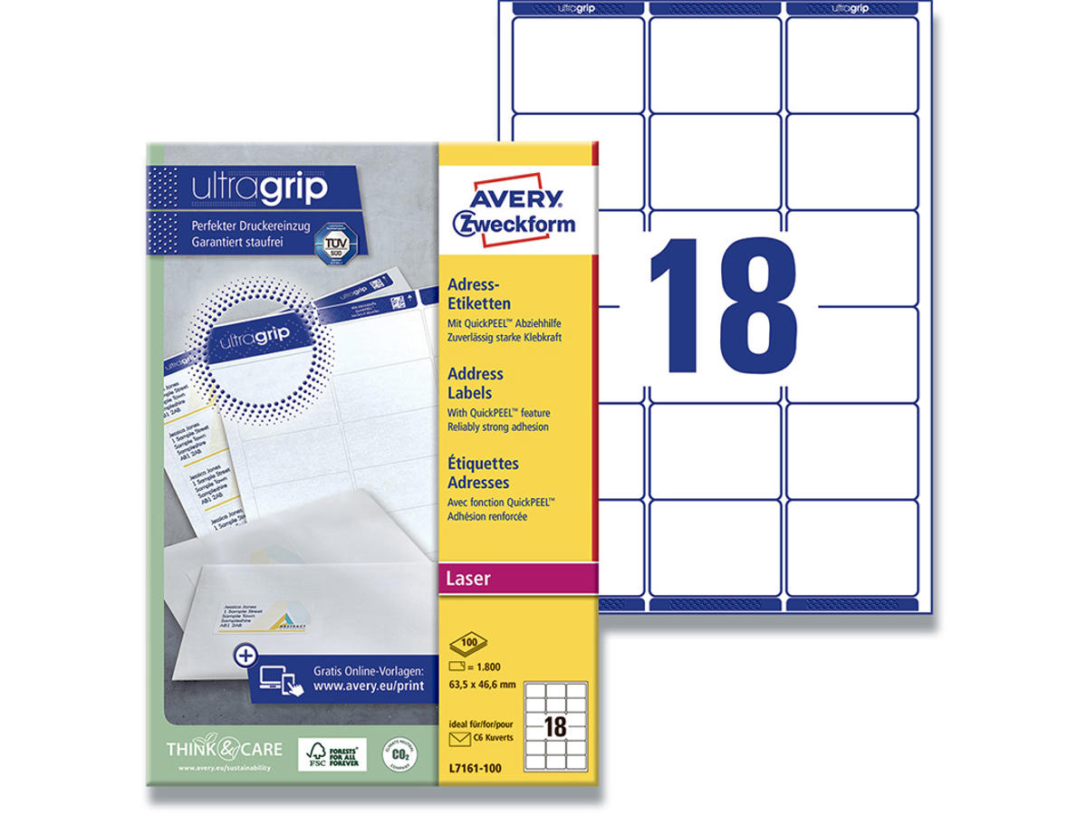 Du har kun to hænder, men et hav af opgaver på dit skrivebord. Og invitationen til næste uges konference skal med posten senest i eftermiddag kl. 16.00 - men hvordan skal du nå det hele på den halve tid? Store som små brevudsendelser bliver meget nemmere når du bruger Avery's hvide L7161-100 QuickPEEL™ etiketter med 18 etiketter/ark og 1.800 etiketter/pk. Du skal blot fjerne den perforerede del af bagarket for at blotte hjørnerne af etiketterne så du nemt kan få dem af og sætte dem på konvolutterne. Det giver en væsentlig tidsbesparelse, fordi du ikke skal fumle med at få fat i hjørnerne af etiketterne – faktisk helt op til 25% af den tid, du bruger, hvis du ikke benytter QuickPEEL™ funktionen. Du kan selvfølgelig også tage dem af på normalvis uden at fjerne den perforerede del. Denne pakke med 100 ark er perfekt til store brevforsendelser og etiketstørrelsen er især god til C6 konvolutter. De er kompatible med alle standard s/h- og farvelaserprintere. Den høje papirkvalitet giver dig flotte og knivskarpe prints. Og Avery's JamFREE™ garanti sikrer at du ikke behøver bekymre dig om etiketterne sidder fast i printeren og giver printerstop. Etiketterne klæber pålideligt og permanent. Avery's etiketter med QuickPEEL™ sparer dig ikke kun tid, men hjælper dig også med at passe på miljøet, da de kan genanvendes sammen med almindeligt papiraffald. Du kan nemt og helt gratis designe og printe dine Avery produkter med vores software Avery Design & Print, hvor du finder skabeloner, grafik og designs - Klik her