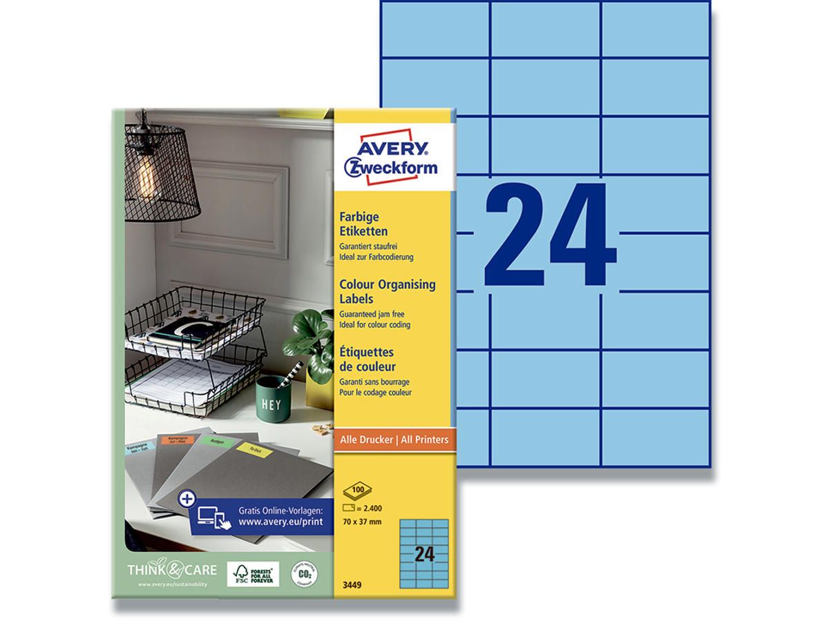 Farvede etiketter får mere opmærksomhed. Alle virksomheder sætter pris på orden. En måde at skabe orden på, er at sortere dine dokumenter efter farve, brug f.eks. Avery's 3449 permanentklæbende blå etiketter med 24 etiketter/ark og 2.400 etiketter/pakke til dine kunders dokumenter, gul for dine leverandører, rød til interne dokumenter osv.