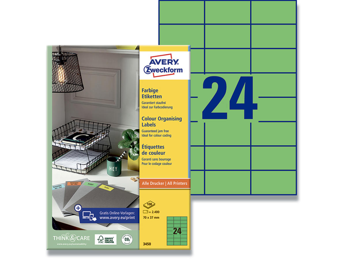 Farvede etiketter får mere opmærksomhed. Alle virksomheder sætter pris på orden. En måde at skabe orden på, er at sortere dine dokumenter efter farve, brug f.eks. Avery's 3450 permanentklæbende grønne etiketter med 24 etiketter/ark og 2.400 etiketter/pakke til dine kunders dokumenter, gul for dine leverandører, rød til interne dokumenter osv.
