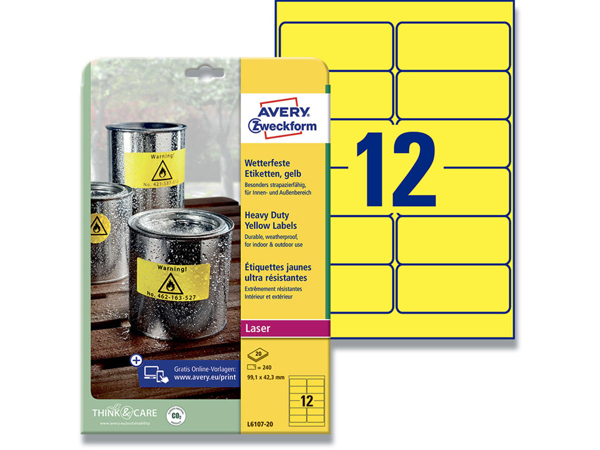 Instruktioner, vigtige meddelelser og advarsler skal være iøjnefaldende og fremstå klare og tydelige for læserne! Men hvordan kan du sikre dig, at dine instruktioner, vigtige beskeder og advarsler fanger alles opmærksomhed, er letlæselige og bliver siddende, hvor du hænger dem op? Avery’s stærke gule etiketter er særdeles velegnede til vedvarende permanent, synlig og iøjnefaldende advarselsskiltning og mærkning både inden- og udendørs, og et absolut godt valg. De er fremstillet i et stærkt holdbart polyestermateriale, som ikke kan rives i stykker, og de klæber permanent og pålideligt. Etiketpapiret er skarp gult, og papirkvaliteten giver dig flotte og knivskarpe prints. Etiketterne er modstandsdygtige overfor olie, snavs, vand, fugt, UV-stråler og temperaturer mellem -20°C og +80°C. Det gør dem ideelle udendørs i alt slags vejr og indendørs, i miljøer med høje krav til holdbarhed. Anvendelsesmulighederne indenfor advarselsskiltning og mærkning er utallige. De henvender sig f.eks. til elektrikere, installatører håndværkere, produktionsvirksomheder, malervirksomheder, laboratorier, hospitaler, lagerfaciliteter m.v. hvor arbejdssikkerheden skal være i top, og hvor der mange advarsler forbundet med brug af produktionsudstyr, el-tavler, målerskabe mv. Avery's L6107-20 gule stærke etiketter har 12 etiketter/ark og 240 etiketter/pk, hvor hver etiket måler 99,1 x 42,3 mm. Etiketternes størrelse er velegnet til mellemstore genstande, f.eks malerbøtter, målerskabe, produktionsudstyr. Etiketterne kan printes i alle s/h laserprintere. Og Avery's JamFREE™ garanti sikrer at du ikke behøver bekymre dig om etiketterne sidder fast i printeren og giver printerstop. Du kan nemt og helt gratis designe og printe dine Avery produkter med vores software Avery Design & Print, hvor du finder skabeloner, grafik og designs - Klik her