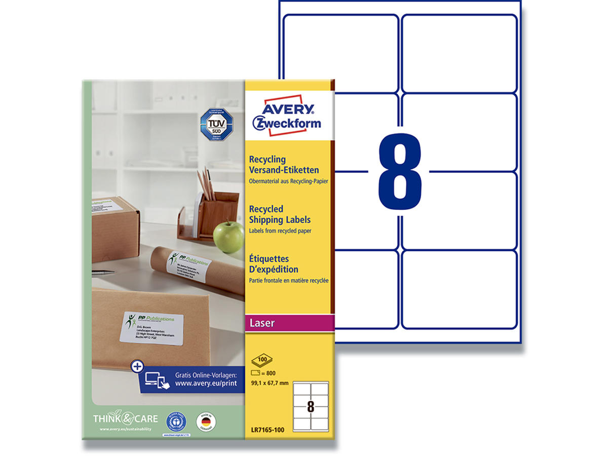 Ønsker du et ”grønnere” kontor? Bruger du allerede miljøvenlige produkter? Hvis din arbejdsplads ønsker at gøre hvad den kan for at skåne miljøet så brug Avery LR7165-100 etiketter med QuickPEEL™ af 100% genbrugspapir med 8 etiketter/ark og 800 etiketter/pk. De er produceret af 100% genbrugspapir, har en vandbaseret og miljøvenlig lim, og er pakket i genbrugskarton. Og det er ikke det hele! Produktionsprocessen af disse etiketter er designet til at undgå unødvendig skovrydning, samt bruge mindre energi og vand. Og udover en grøn samvittighed, så får du også flotte og knivskarpe prints uanset hvilken slags printer du benytter. Avery's JamFREE™ garanti sikrer at du ikke behøver bekymre dig om etiketterne sidder fast i printeren og giver printerstop. Etiketterne klæber pålideligt og permanent. Du kan nemt og helt gratis designe og printe dine Avery produkter med vores software Avery Design & Print, hvor du finder skabeloner, grafik og designs - Klik her
