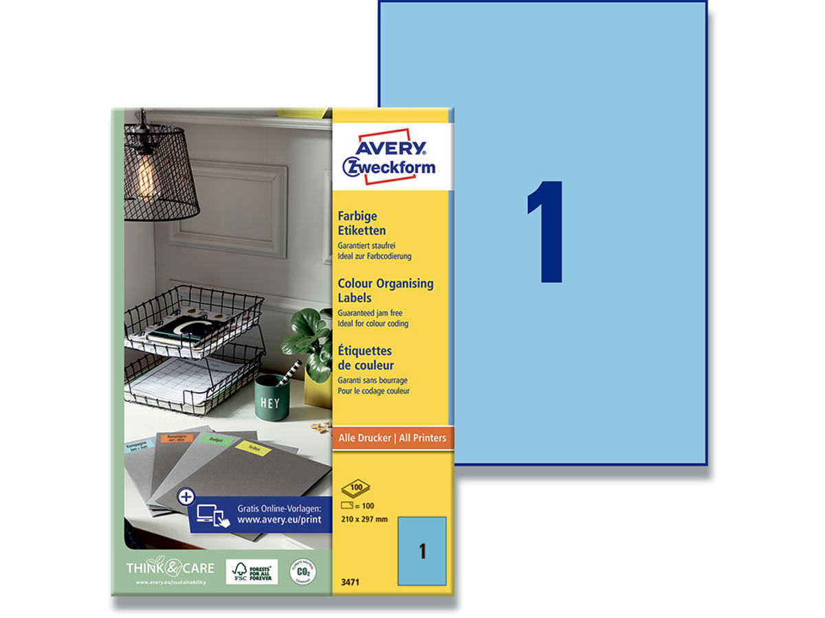 Farvede etiketter får mere opmærksomhed. Alle virksomheder sætter pris på orden. En måde at skabe orden på, er at sortere dine dokumenter efter farve, brug f.eks. Avery's 3471 permanentklæbende blå etiketter med 1 etiketter/ark og 100 etiketter/pakke til dine kunders dokumenter, gul for dine leverandører, rød til interne dokumenter osv.