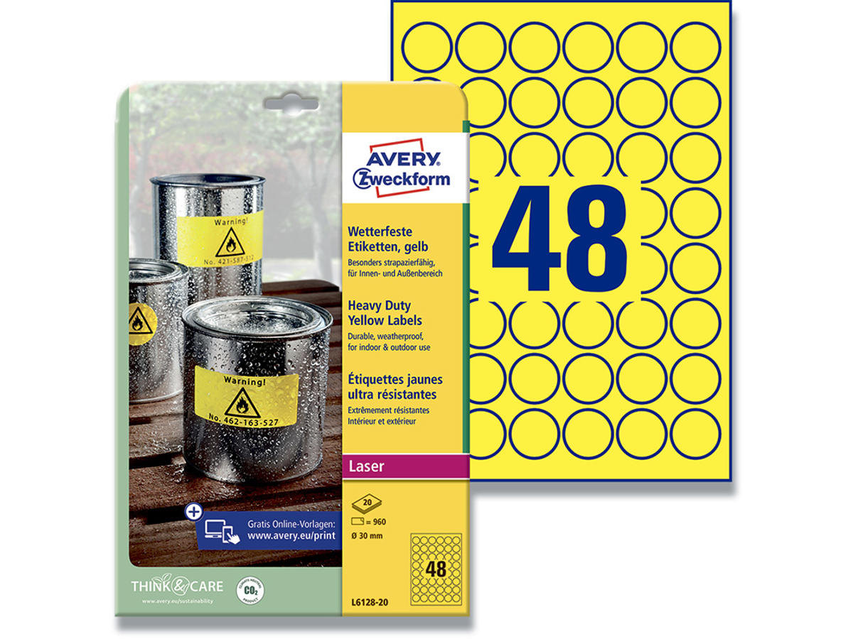 Instruktioner, vigtige meddelelser og advarsler skal være iøjnefaldende og fremstå klare og tydelige for læserne! Men hvordan kan du sikre dig, at dine instruktioner, vigtige beskeder og advarsler fanger alles opmærksomhed, er letlæselige og bliver siddende, hvor du hænger dem op? Avery’s stærke gule etiketter er særdeles velegnede til vedvarende permanent, synlig og iøjnefaldende advarselsskiltning og mærkning både inden- og udendørs, og et absolut godt valg. De er fremstillet i et stærkt holdbart polyestermateriale, som ikke kan rives i stykker, og de klæber permanent og pålideligt. Etiketpapiret er skarp gult, og papirkvaliteten giver dig flotte og knivskarpe prints. Etiketterne er modstandsdygtige overfor olie, snavs, vand, fugt, UV-stråler og temperaturer mellem -20°C og +80°C. Det gør dem ideelle udendørs i alt slags vejr og indendørs, i miljøer med høje krav til holdbarhed. Anvendelsesmulighederne indenfor advarselsskiltning og mærkning er utallige. De henvender sig f.eks. til elektrikere, installatører håndværkere, produktionsvirksomheder, malervirksomheder, laboratorier, hospitaler, lagerfaciliteter m.v. hvor arbejdssikkerheden skal være i top, og hvor der mange advarsler forbundet med brug af produktionsudstyr, el-tavler, målerskabe mv. Avery's L6128-20 gule runde stærke etiketter har 48 etiketter/ark og 960 etiketter/pk, hvor hver etiket måler Ø 30 mm. Etiketternes størrelse er velegnet til mindre genstande, f.eks. laboratorieglas, eltavler. Etiketterne kan printes i alle s/h laserprintere. Og Avery's JamFREE™ garanti sikrer at du ikke behøver bekymre dig om etiketterne sidder fast i printeren og giver printerstop. Du kan nemt og helt gratis designe og printe dine Avery produkter med vores software Avery Design & Print, hvor du finder skabeloner, grafik og designs - Klik her