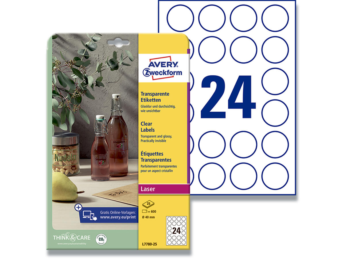 Har du et produkt du skal ud og sælge, så vil du gerne have at det skal se professionelt ud på hylderne. Med Avery's L7780-25 gennemsigtige runde etiketter med 24 etiketter/ark og 600 etiketter/pakke er det nemt og enkelt at få det udseende du ønsker til dine produktetiketter. Disse helt gennemsigtige etiketter giver et stilfuldt og næsten usynligt udseende på dine produkter, dokumenter og kontorartikler. De egner sig også perfekt til forsegling af produktemballage på f.eks. folie poser, glas, flasker og ligende. De klæber på glas, polerede overflader samt metal og plastik. Og så er de holdbare (modstandsdygtige overfor smuds, vand og olie), kan ikke rives i stykker og tåler temperaturer fra -20 til +80 °C. Og du behøver ikke betale en ekstern leverandør for at trykke dem, du kan med hjælp af Avery’s gratis software nemt og enkelt selv designe og printe dem fra din egen printer præcis i det antal du har behov for så dine produkter kan komme på hylderne. Kan printes i alle laser- og farvelaser printere. Du kan nemt og helt gratis designe og printe dine Avery produkter med vores software Avery Design & Print, hvor du finder skabeloner, grafik og designs - Klik her