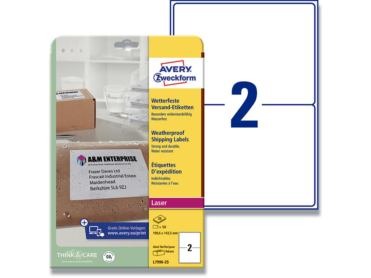 Sender du pakker og forsendelser, og vil du gerne sørge for at de kommer frem i god behold? Avery's vejrbestandige pakkeetiketter L7996-25 med 2 etiketter/ark og 50 etiketter/pk er lavet af et kraftigt polyestermateriale, som er slidstærkt og modstandsdygtigt overfor olie, smuds, vand og UV-stråler samt tåler temperaturer fra -20°C til +80°C. Det sikrer at der ikke sker udtværing af adressen hvis etiketten bliver våd, så den er altid ser proffesionel ud og er let at læse for post- og pakkebudet. De er ideelle at bruge på alle slags kuverter og emballage også polythylen og Tyvek®-konvolutter. Du kan nemt og helt gratis designe og printe dine Avery produkter med vores software Avery Design & Print, hvor du finder skabeloner, grafik og designs -