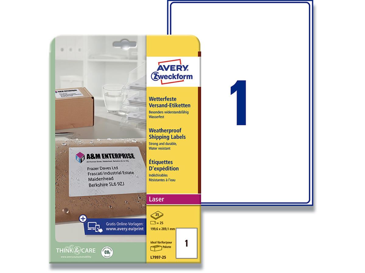 Sender du pakker og forsendelser, og vil du gerne sørge for at de kommer frem i god behold? Avery's vejrbestandige pakkeetiketter L7997-25 med 1 etiket/ark og 25 etiketter/pk er lavet af et kraftigt polyestermateriale, som er slidstærkt og modstandsdygtigt overfor olie, smuds, vand og UV-stråler samt tåler temperaturer fra -20°C til +80°C. Det sikrer at der ikke sker udtværing af adressen hvis etiketten bliver våd, så den er altid ser proffesionel ud og er let at læse for post- og pakkebudet. De er ideelle at bruge på alle slags kuverter og emballage også polythylen og Tyvek®-konvolutter. Du kan nemt og helt gratis designe og printe dine Avery produkter med vores software Avery Design & Print, hvor du finder skabeloner, grafik og designs - Klik her