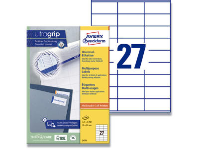 Etiketter, 70x50.8 mm, Hvid, 1500 etiketter i alt, Avery Ultragrip