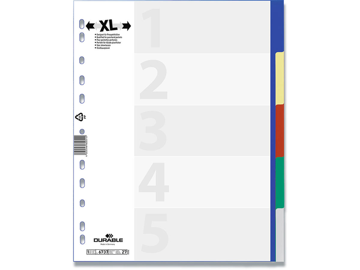 Ekstra bredt 5-delt faneblad i pp-plast med kulørte faneblade. Fortrykt forblad med skriveområde (kan ikke udskrives i PC). Universalhullet. A4 plus format.