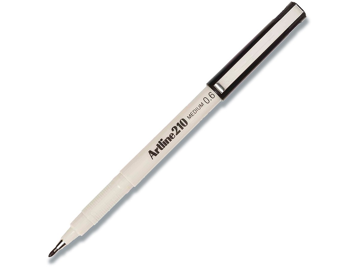 Fineliner med 0,6 mm forstærket fiberspids og støtterør. Pennen indeholder en vandbaseret blæk som ikke smitter af. Medium skrivebredde.