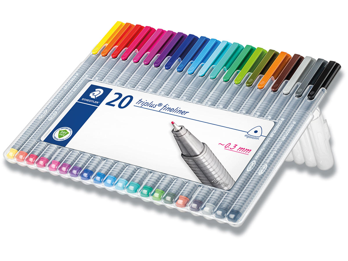 triplus® fineliner med superfin forstærket metalspids i ergonomisk trekantet form til tegning, skrivning, farvelægning, scrapbooking, kortskrivning og meget andet. Finelineren kan ligge uden hætte i dagevis uden at udtørre og har en lang levetid. Den har vandbaseret blæk og kan nemt vaskes ud af de fleste tekstiler. Automatisk trykudligning forhindrer pennen i at lække i ekstreme højder - fx ombord på fly. Stregbredde 0.3 mm. Leveres i smart STAEDTLER stand-up boks med 20 assorterede farver.