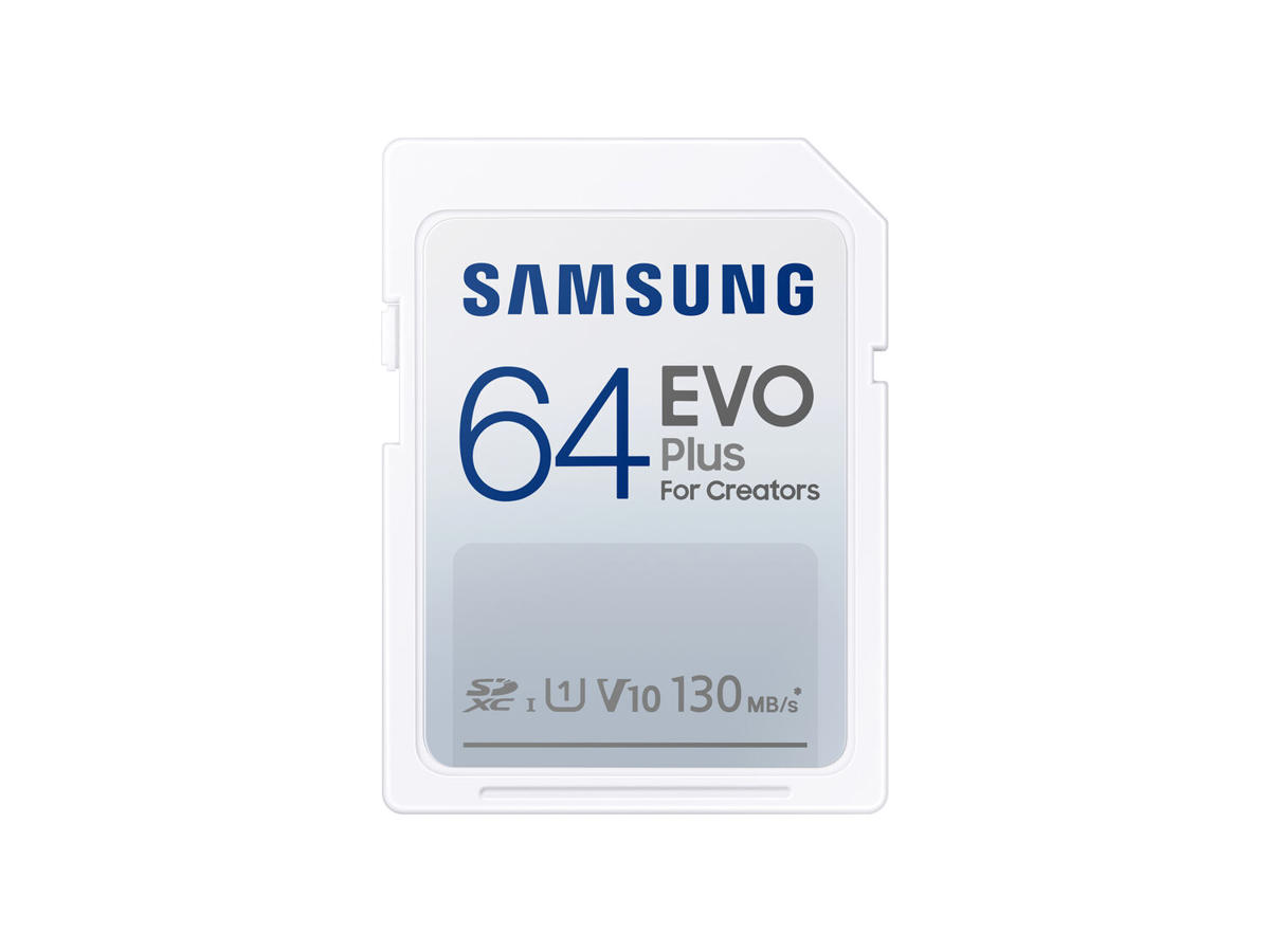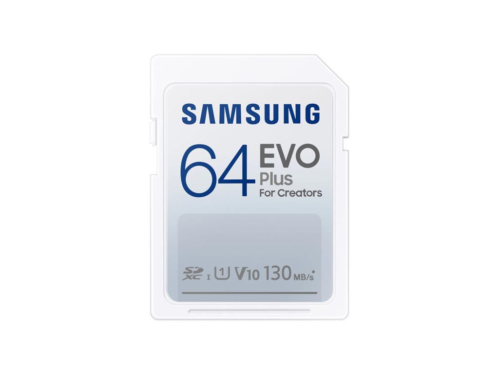 Samsung EVO Plus. Kapacitet: 64 GB, Flashkort type: SDXC, Intern hukommelsestype: UHS-I, Læsehastighed: 130 MB/s, UHS hastighedsklasse: Class 1 (U1), Videohastighedsklasse: V10. Beskyttelsesfunktioner: Magnetsikker, Stødresistent, Vandtæt, Røntgenbestandig, Temperaturbestandigt, Produktfarve: Hvid