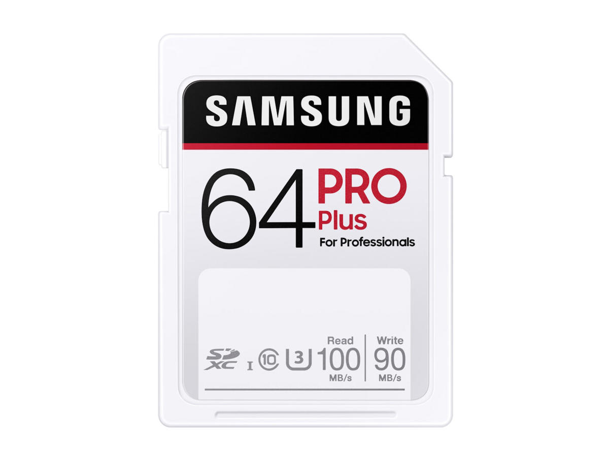 Samsung PRO Plus. Kapacitet: 64 GB, Flashkort type: SDXC, Flash-hukommelse klasse: Klasse 10, Intern hukommelsestype: UHS-I, Læsehastighed: 100 MB/s, Skrivehastighed: 90 MB/s, UHS hastighedsklasse: Class 3 (U3). Beskyttelsesfunktioner: Kuldebestandig, Varmeresistent, Magnetsikker, Splintfri, Vandtæt, Røntgenbestandig