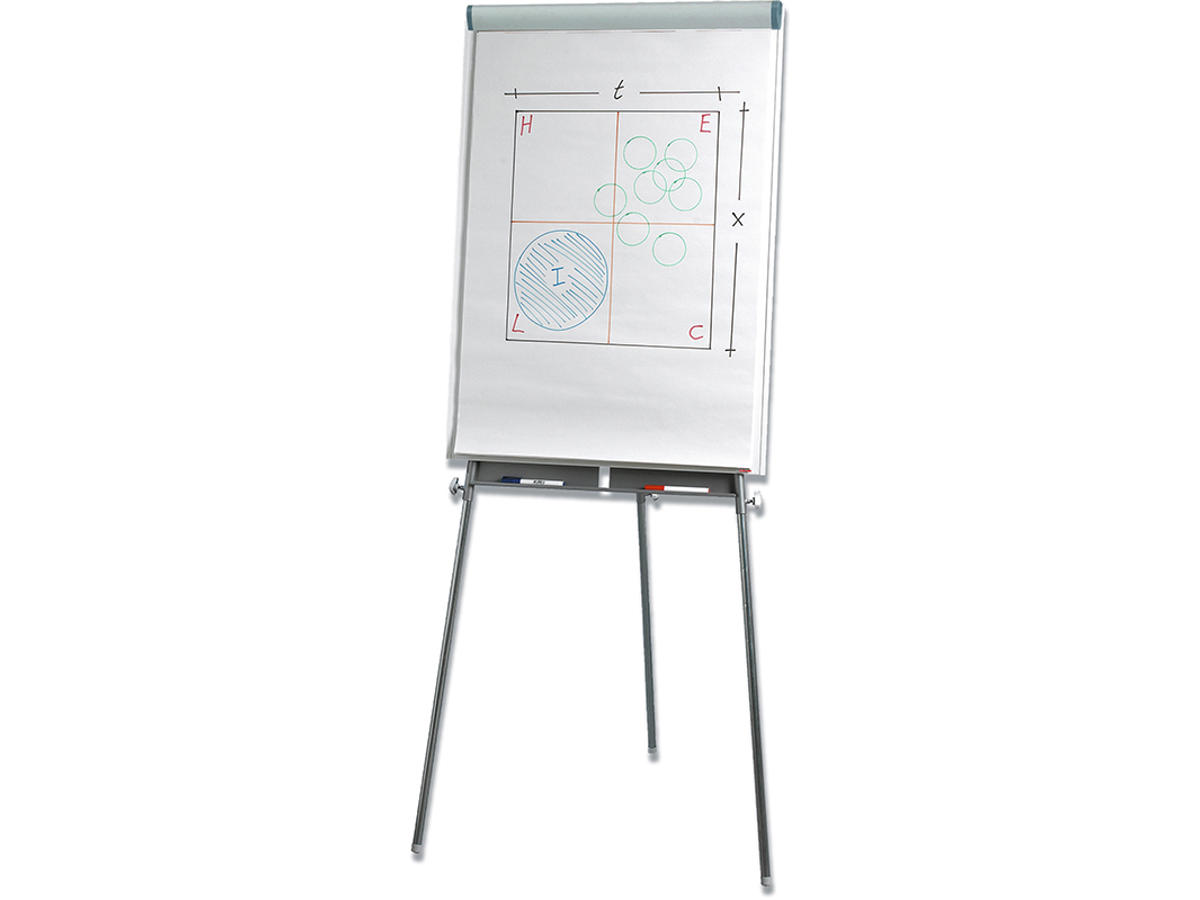 Esselte flipoverstativ Standard, holdbart flipoverstativ til professionelle brugere. Hvidlakeret, magnetisk whiteboardtavle plade 70x100 cm med skjult universal blokophæng. Justerbar højde og sølvlakeret ramme.