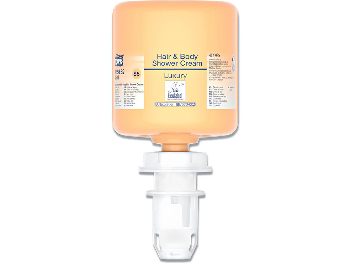 Tork Luksus Hair & Body Mini Shower Cream giver en luksuriøs 3-in-1 badeoplevelse, som passer perfekt til hoteller, spa’er og sportsfaciliteter. Med argan-olie og balsam, har den hele tre fordele som forfriskende shampoo, balsam og fugtende shower cream. Håret og kroppen bliver vasket blidt, mens balsameffekten gør håret blødt og nemt at rede. Passer til Tork Dispenser til Sæbe og Hånddesinfektion, som er certificeret “nem at bruge” og sørger for god håndhygiejne for alle brugere.
