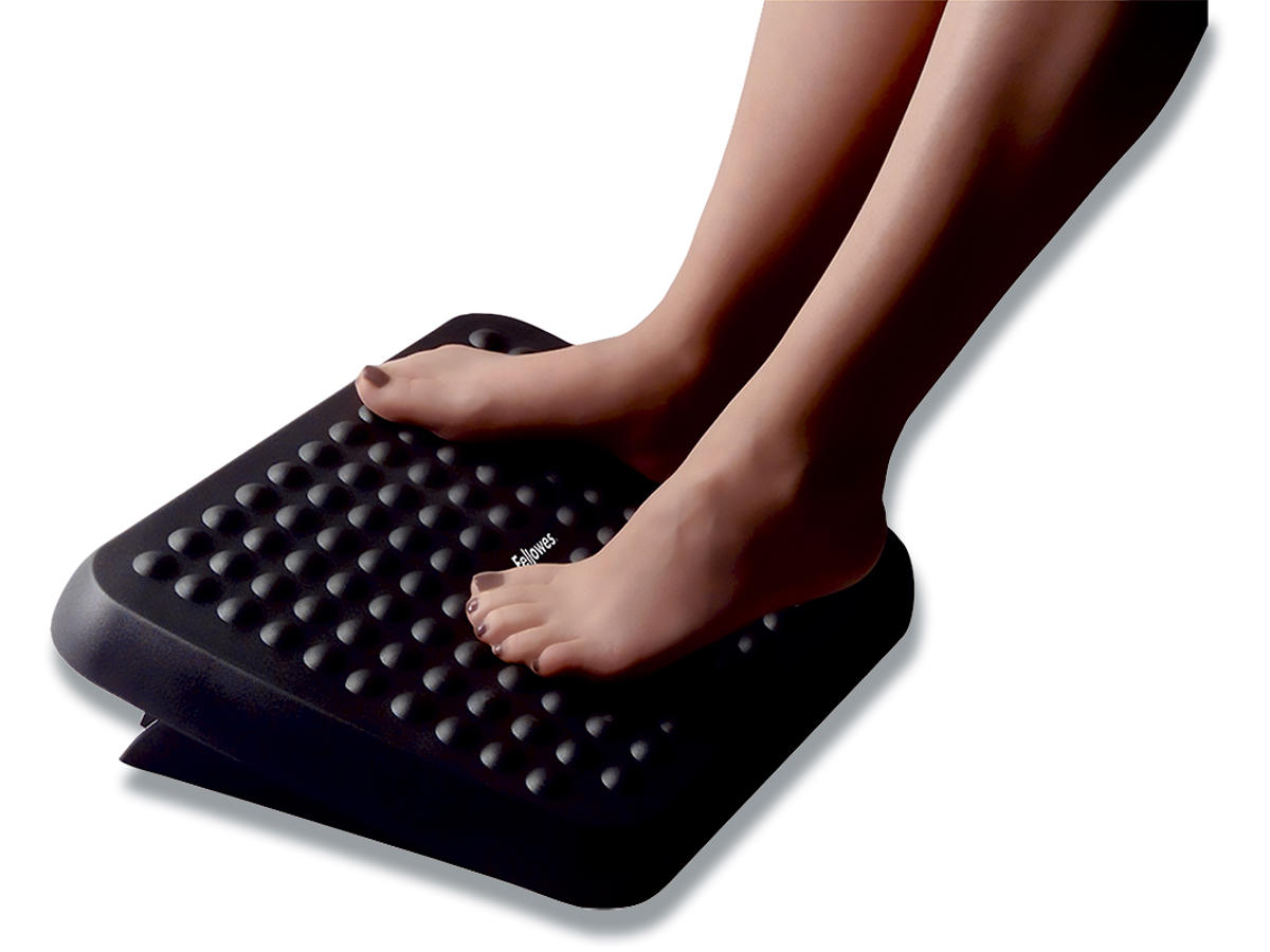 Fellowes standardfodstøtten forbedrer holdningen og mindsker trykket på bagsiden af lårene, så belastningen af ben og det nederste af ryggen nedsættes. 2-positions højdejustering for maksimal komfort. Fritflydende platformbevægelse. Struktureret overflade, der masserer fodsålerne og reducerer stress