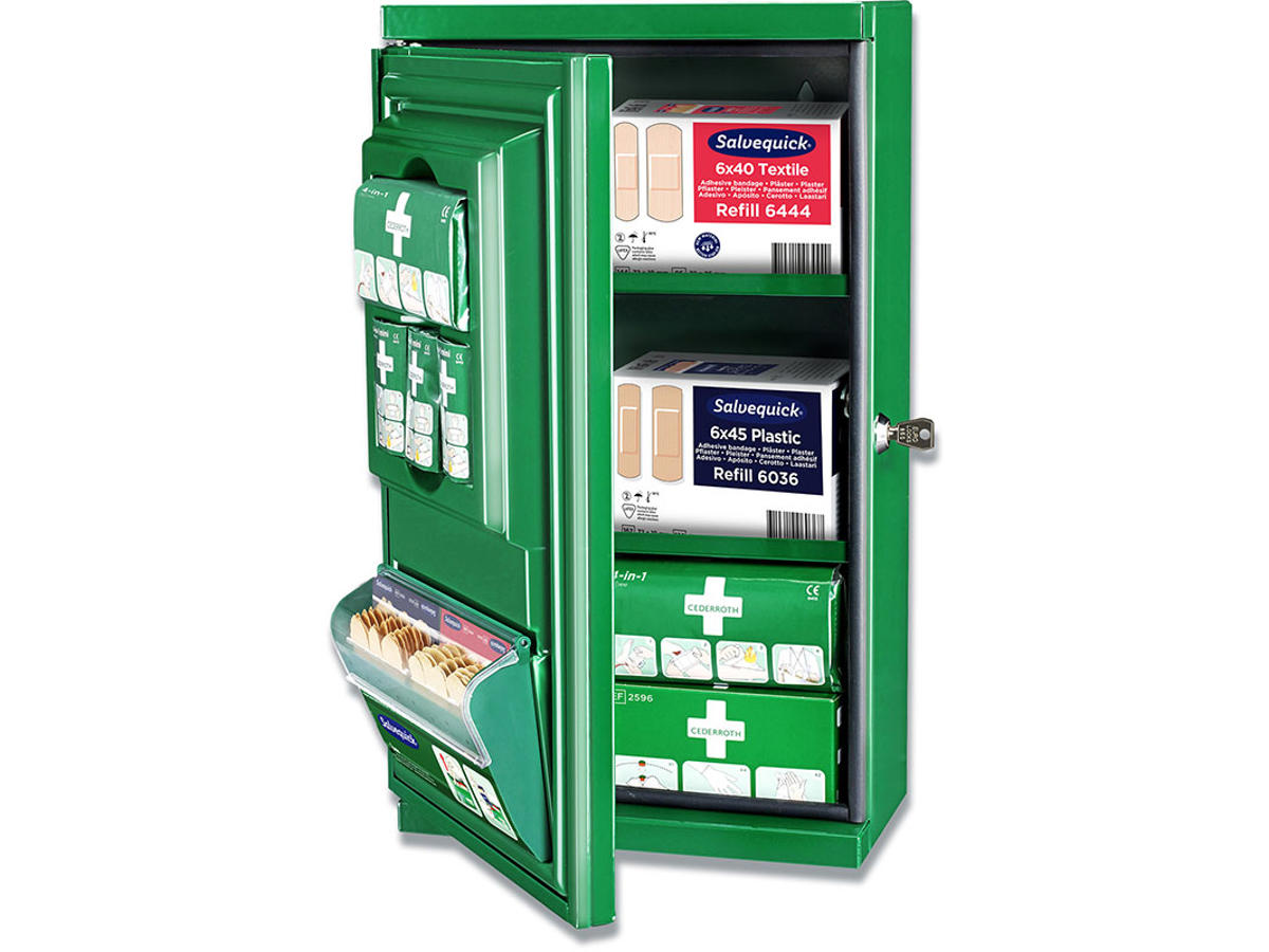 Låsbart skab i metal med en lille førstehjælpstavle monteret på forsiden. Inde i skabet er der forbindinger og plaster til genopfyldning af tavlen: 6 x 45 stk. plastplaster, 6 x 40 stk. tekstilplaster, beskyttelsespakke, en stor og en lille blodstopper, saks og pincet. Mål: B26 x H40 x D17 cm. Tydelige farvebilleder og instruktioner er trykt direkte på emballagerne.