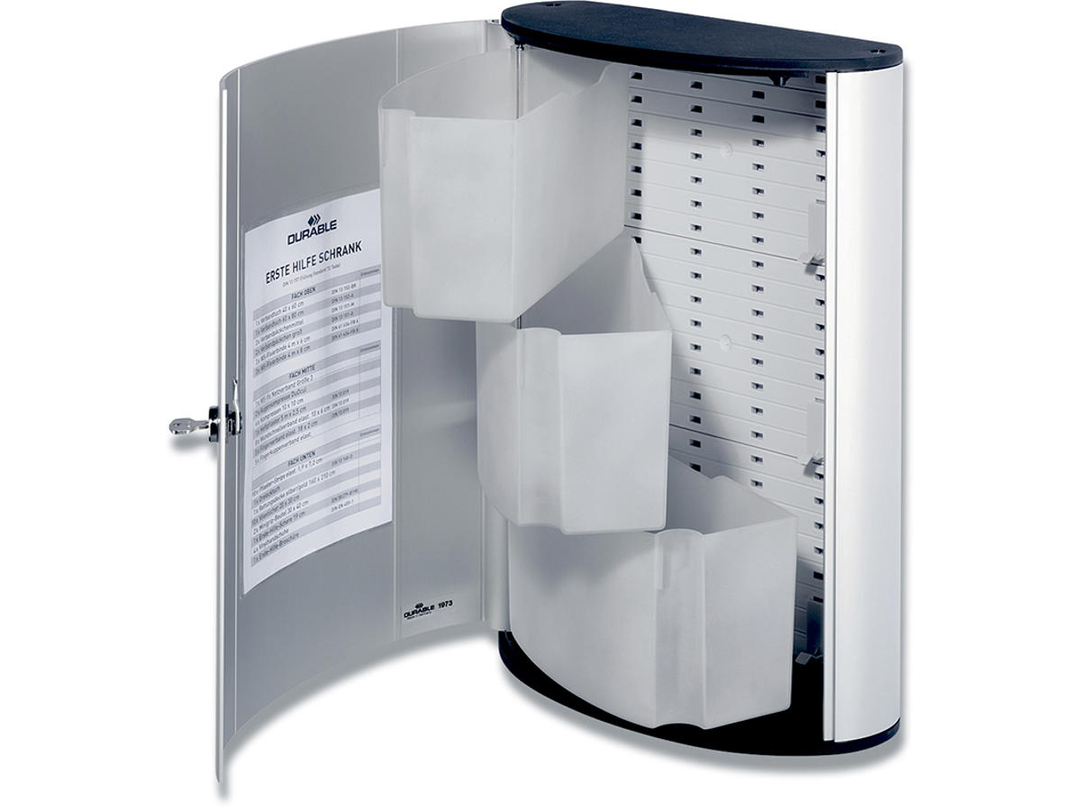 Praktisk førstehjælpsskab i flot design af børstet aluminium. Tre svingbare fag til opbevaring af førstehjælpsartikler. Skabet kan låses og der medfølger to nøgler. Førstehjælpssortiment Durable art nr 1975-00 kan bestilles separat. Mål 400 x 302 x 118 mm. (HxBxD).