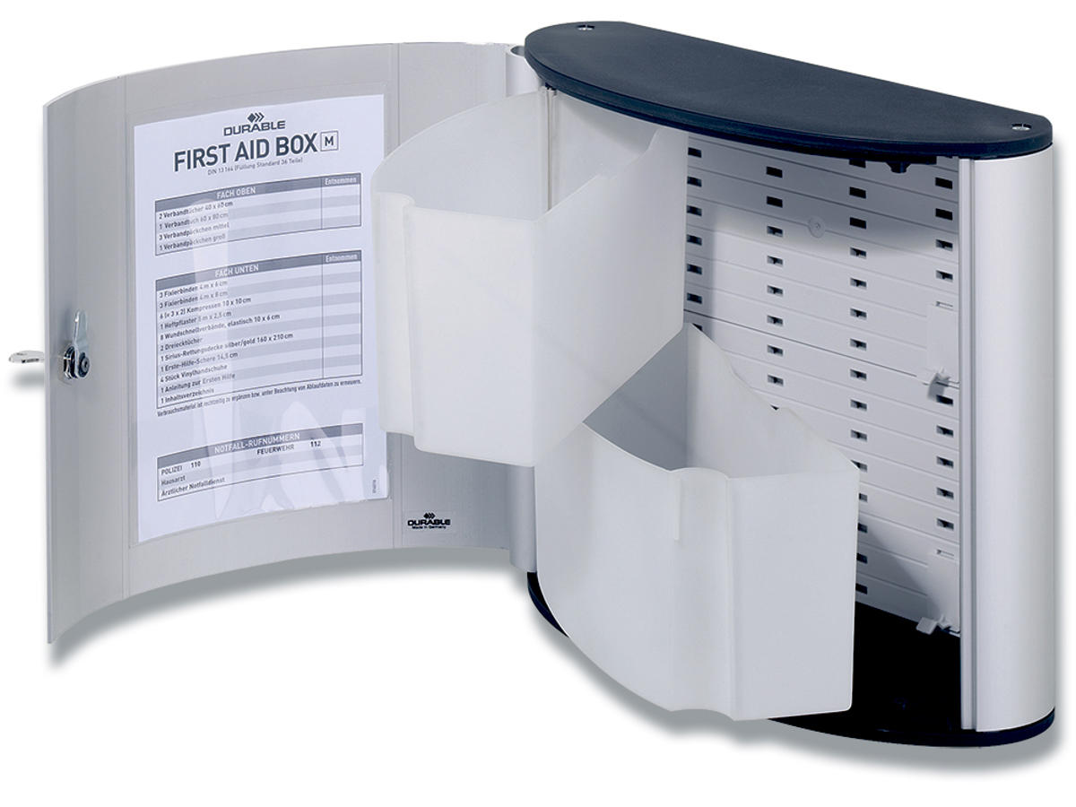 Praktisk førstehjælpsskab i flot design af børstet aluminium. To svingbare fag til opbevaring af førstehjælpsartikler. Skabet kan låses og der medfølger to nøgler. Førstehjælpssortiment Durable art nr 1972-00 kan bestilles separat. Mål 280 x 302 x 118 mm. (HxBxD).