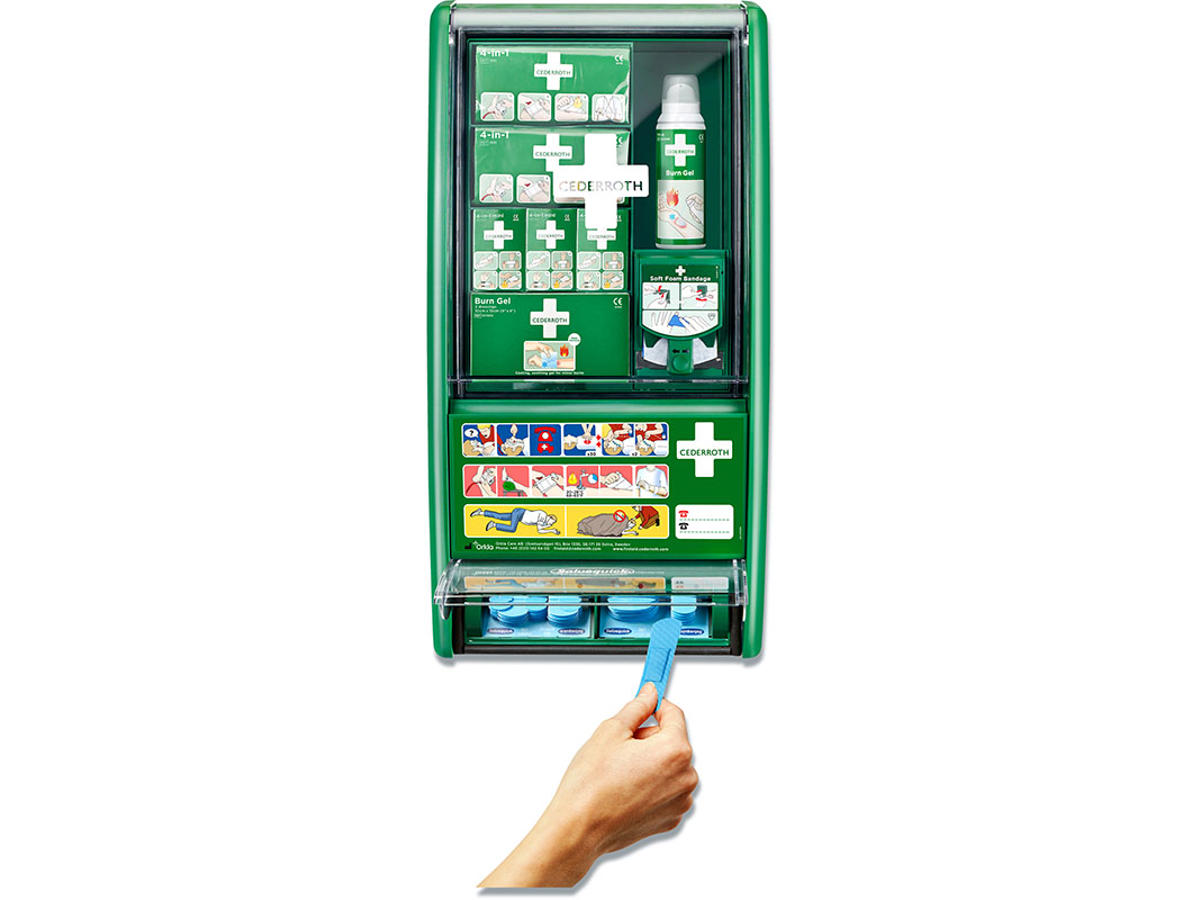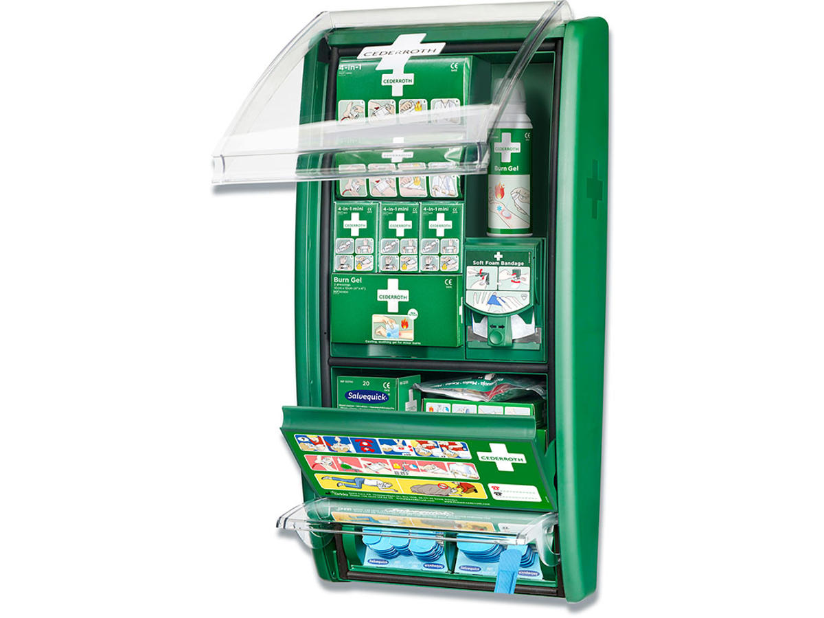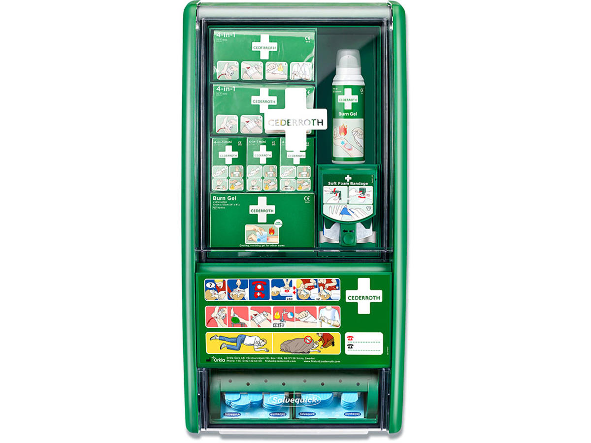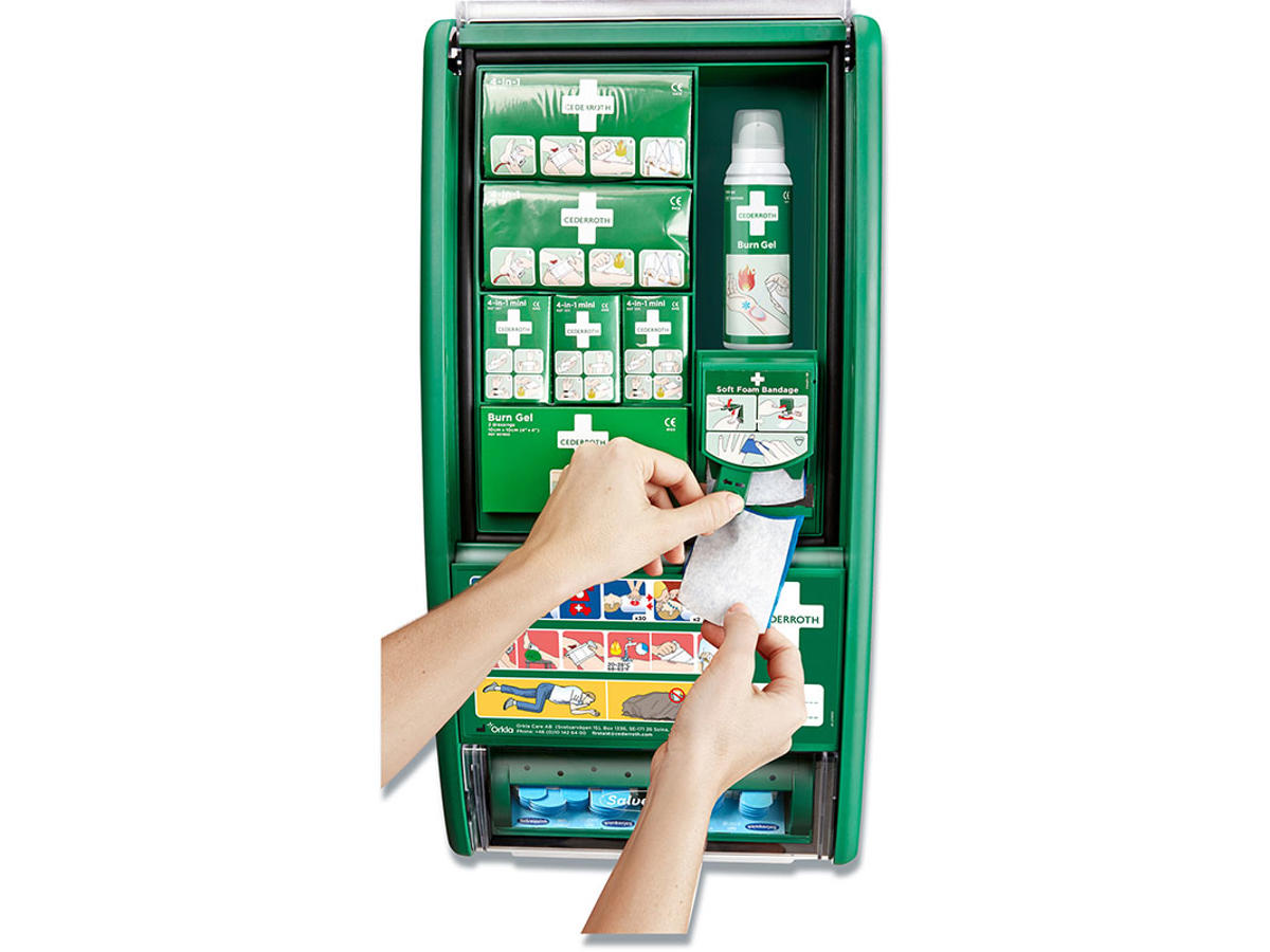 Cederroth First Aid & Burn Station Det her er en Førstehjælpsstationen til alle, som arbejder inden for fag med stor risiko for forbrændinger, eksempelvis kokke, elektrikere og svejsere.