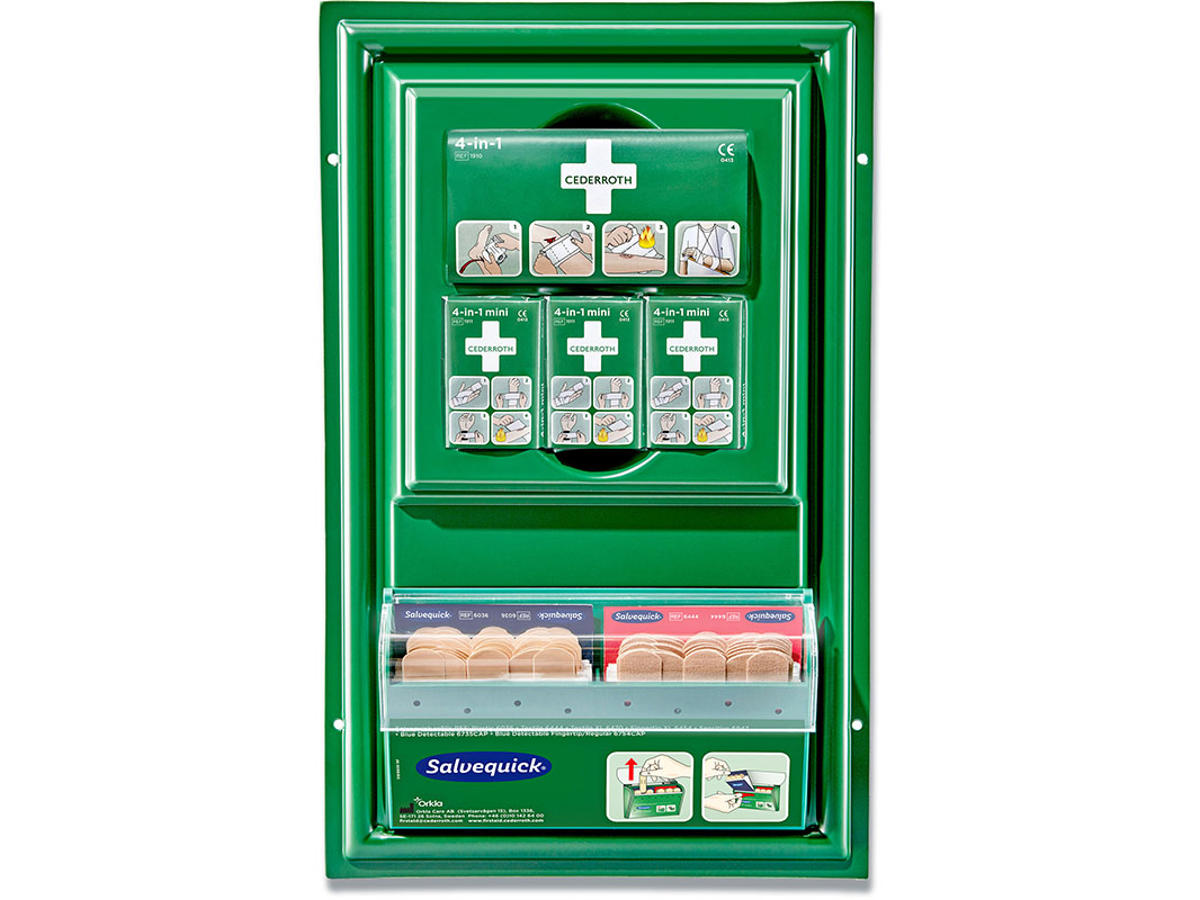 Førstehjælpstavle med instruktioner. Den er nem at overskue og genopfylde. Tavlen indeholder en stor og tre små blodstoppere samt en plasterautomat. Mål: B25 x H40 x D5 cm.