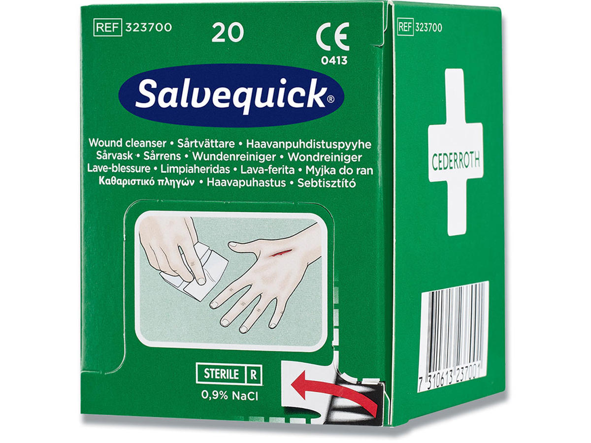 Salvequick Sårrens passer i Cederroth Førstehjælpsstation. Salvequick Sårrens erstatter bomuld og såropløsning i flaske. Smidige og enkle at bruge. Godt beskyttede i hver sin emballage. Rengøringsvæsken består af steril fysiologisk saltvandsopløsning.