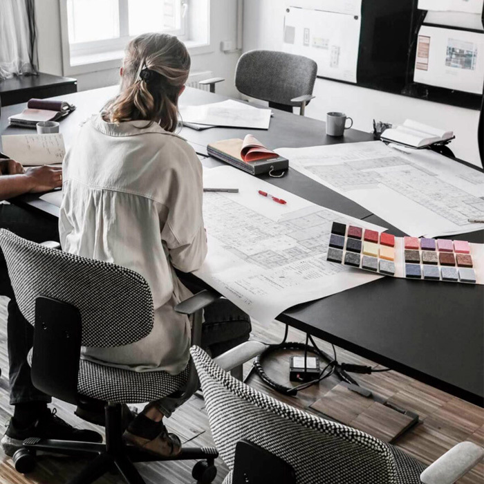 Idé, samarbejde og dialog: Vores designer og projektkoordinator har tæt dialog med jeres arkitekt eller projektansvarlige for at afklare spørgsmål om mål og andre relevante faktorer, der påvirker de konkrete indretningsløsninger.