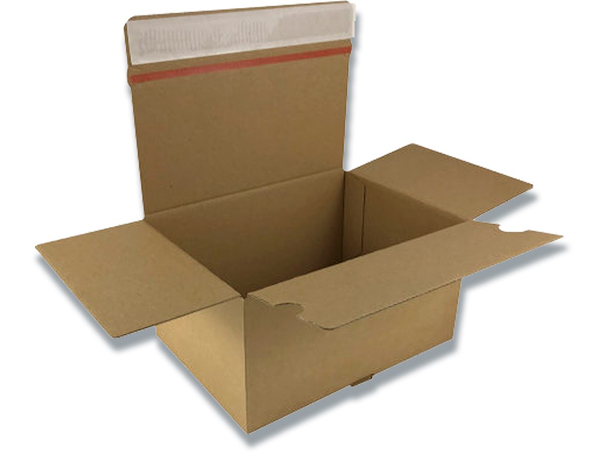 Emballage med automatbund og selvklæbende lukning til fx webshop forsendelser. Tearstrip perforreringen gør kassen nem at åbne for kunden.