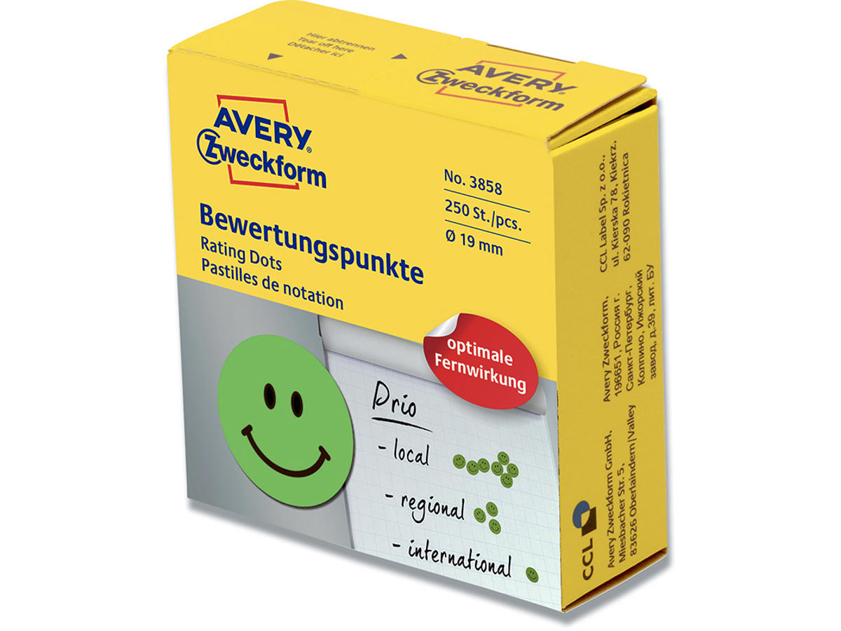 En sticker med en grøn glad smiley siger mere end 1000 ord. Er du skolelærer, pædagog eller underviser kan du med fordel i dit 'rettearbejde' bruge Avery's Belønnings-mærke, 3858, som er runde fortrykte grønne glade smiley stickers til at motivere og inspirere samt uden ord give din mening til kende.