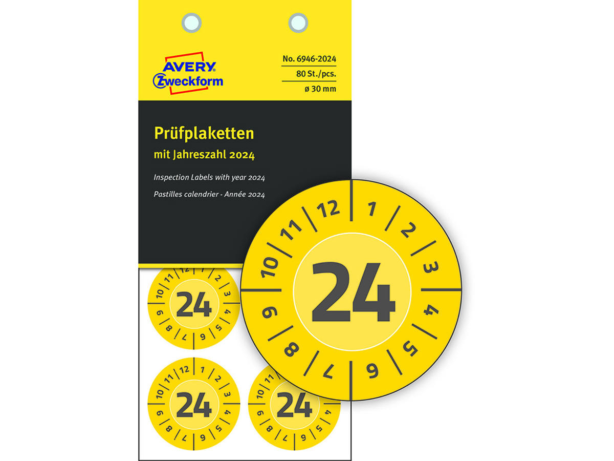 Etiketter, Ø30 mm, 2024 Gul, 80 etiketter i alt, Avery NoPEEL Inspektion