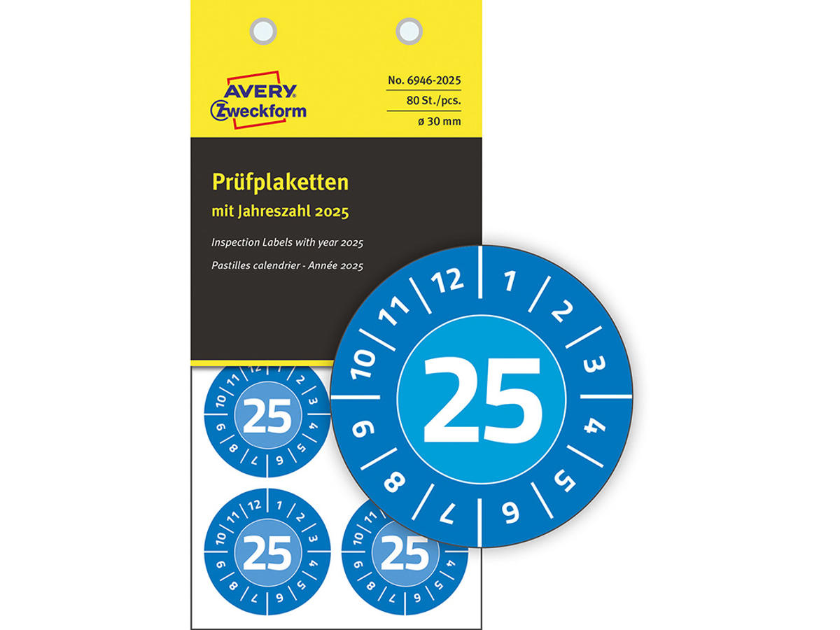 Etiketter, Ø30 mm, 2025 Blå, 80 etiketter i alt, Avery NoPEEL Inspektion