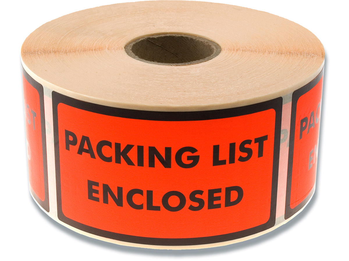 Fluorescerende klistermærke med sort print: "Packing List Enclosed" Format 120x70mm, 1000 etiketter pr. Rulle.