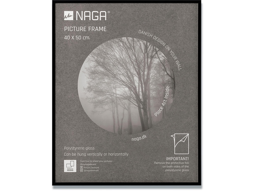 40x50 sort ramme i aluminium. Stilfuld sort ramme med plexiglas udført i aluminium. Den flotte ramme passer til et billede på 40x50 cm. Selve rammen måler 0,9 cm i bredden og 1,4 cm i dybden, hvilket giver et stilfuldt udtryk. Den fine ramme har metalophæng bagpå, så du nemt kan hænge den op. Rammen er udført så du både kan hænge den vertikalt og horisontalt, hvilket giver dig mulighed for at skabe den helt rette billedvæg. En flot sort ramme, som du kan få glæde af i mange år. Indram billeder eller kunst og skab et stilfuldt design på dine vægge.