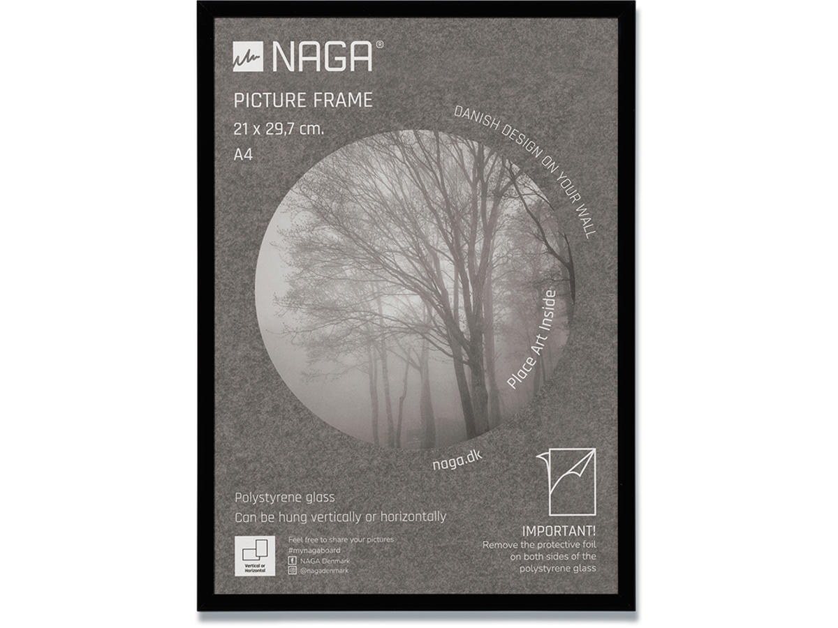A4 sort ramme i aluminium. Stilfuld sort ramme med plexiglas udført i aluminium. Den flotte ramme passer til et billede på 21x29,7 cm, (hvad der svarer til en A4 plakat). Selve rammen måler 0,9 cm i bredden og 1,4 cm i dybden, hvilket giver et stilfuldt udtryk. Den fine ramme har metalophæng bagpå, så du nemt kan hænge den op. Rammen er udført så du både kan hænge den vertikalt og horisontalt, hvilket giver dig mulighed for at skabe den helt rette billedvæg. En flot sort ramme, som du kan få glæde af i mange år. Indram billeder eller kunst og skab et stilfuldt design på dine vægge.