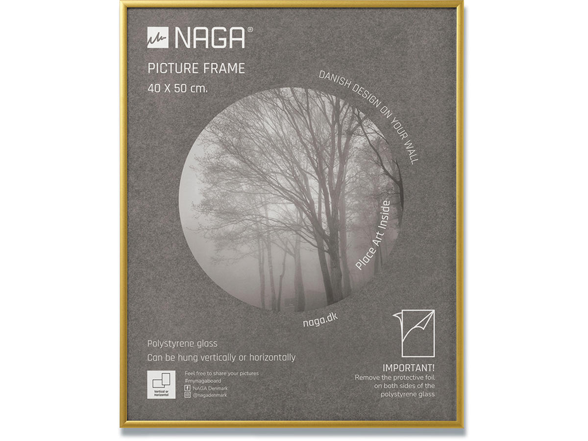 40x50 mat guld ramme i aluminium. Stilfuld mat guld ramme med plexiglas udført i aluminium. Den flotte ramme passer til et billede på 40x50 cm. Selve rammen måler 0,9 cm i bredden og 1,4 cm i dybden, hvilket giver den et stilfuldt udtryk. Den fine ramme har metalophæng bagpå, så du nemt kan hænge den op. Rammen er udført så du både kan hænge den vertikalt og horisontalt, hvilket giver dig mulighed for at skabe den perfekte billedvæg. En flot ramme, som du kan få glæde af i mange år. Indram billeder eller kunst og skab et stilfuldt design på dine vægge.